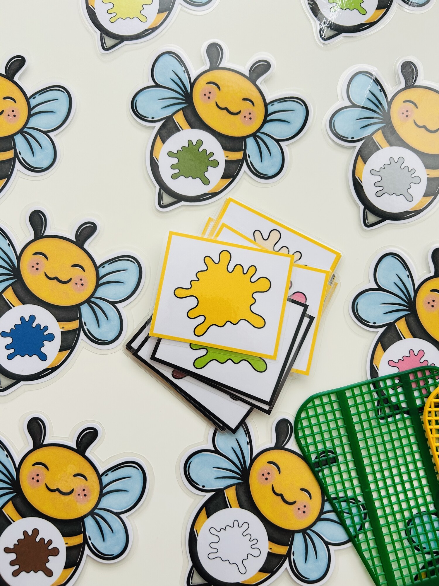 Plácni včelku je hravá aktivita, která dětem pomáhá zábavnou formou procvičit rozpoznávání barev. Materiál obsahuje celkem 40 kartiček – 20 kartiček se zadáním (barevná kaňka) a 20 kartiček se včelkami, které obsahují stejnou barevnou kaňku.