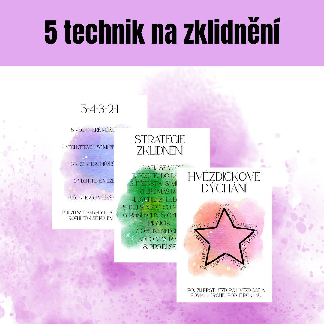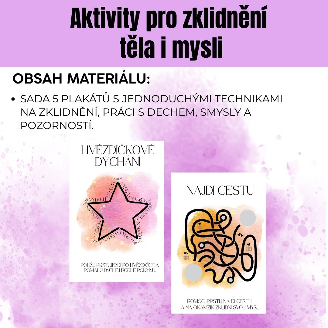 Sada 5 plakátů se snadno použitelnými technikami zklidnění, dechovými cvičeními a prací se smysly i pozorností. Pomáhají uklidnit mysl a navodit pocit bezpečí. Vhodné do třídy, kabinetu i domů.