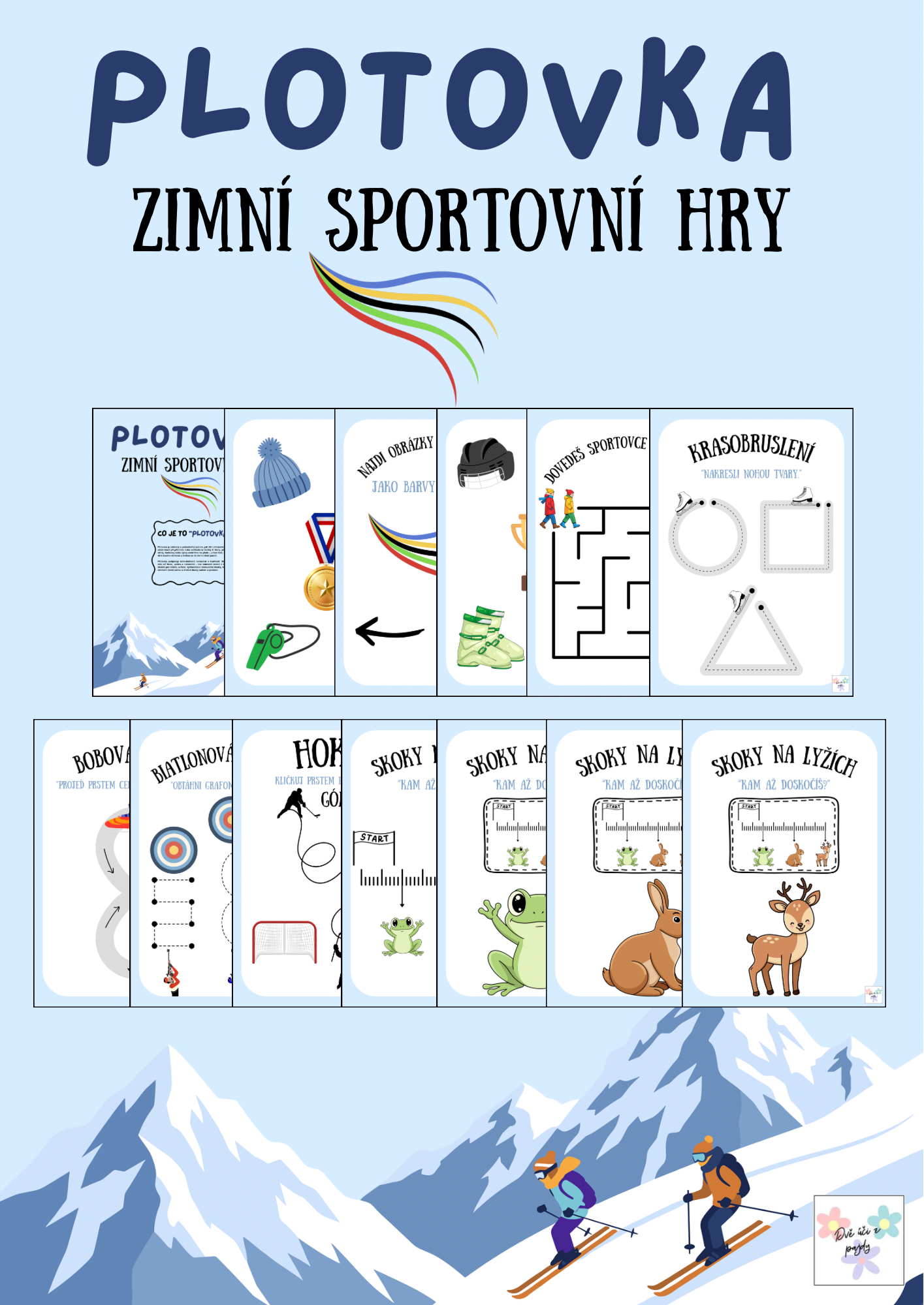 Materiál obsahuje 18 stran PDF s barevnými ilustracemi a úkoly zaměřenými na rozvoj logiky, grafomotoriky a pohybu v duchu zimního sportování.