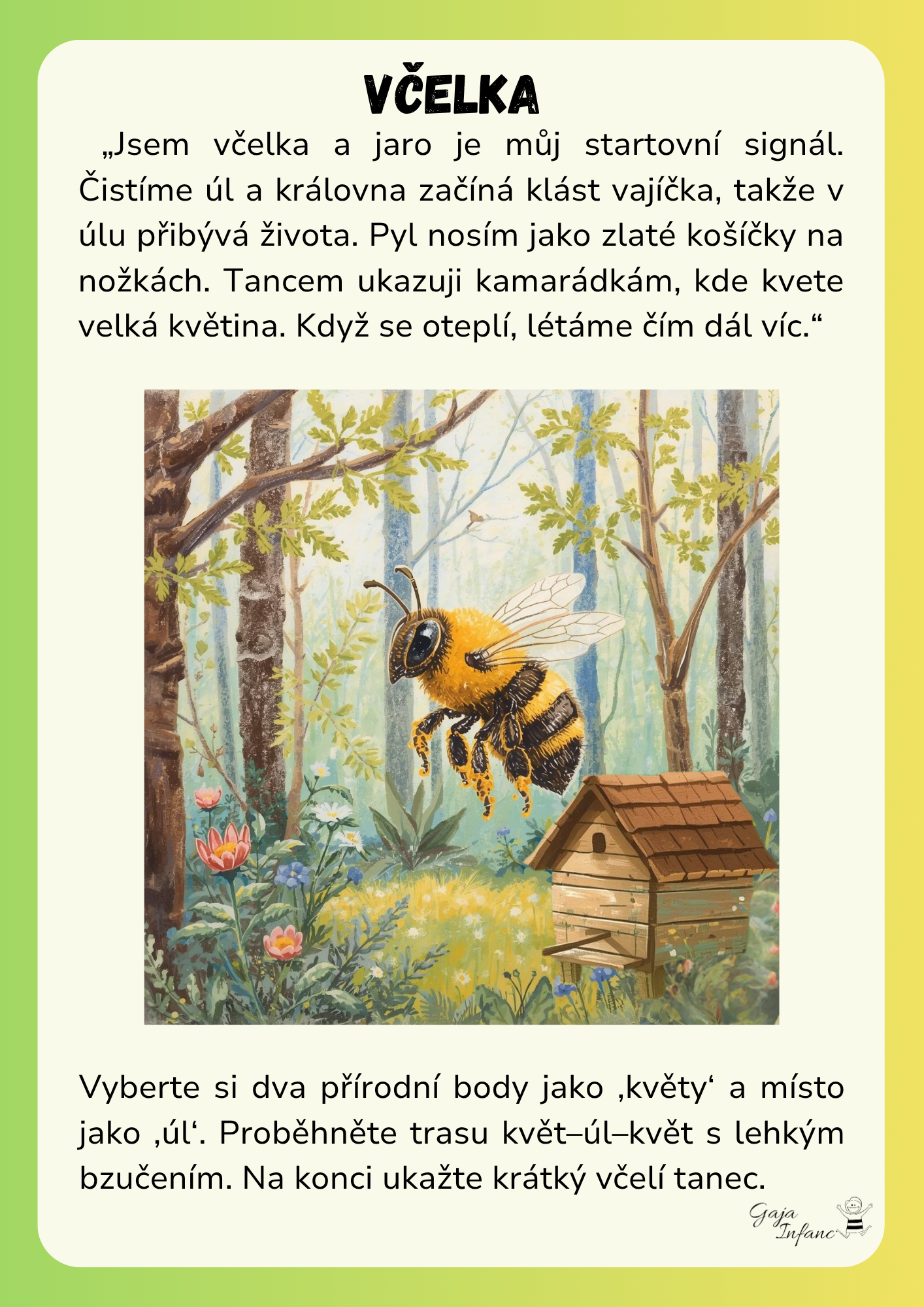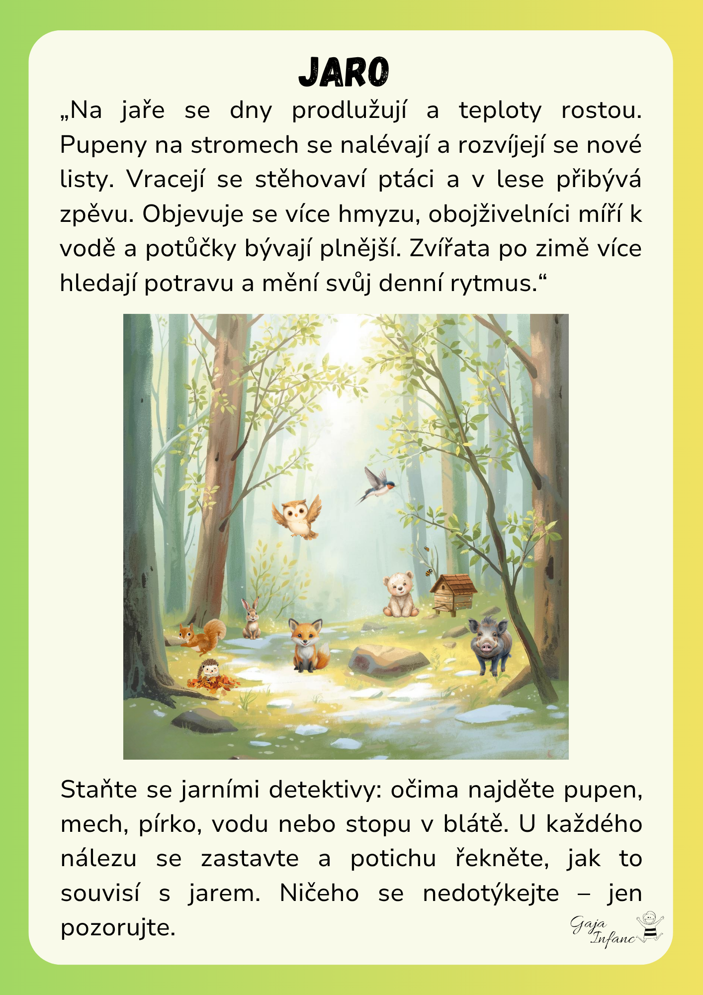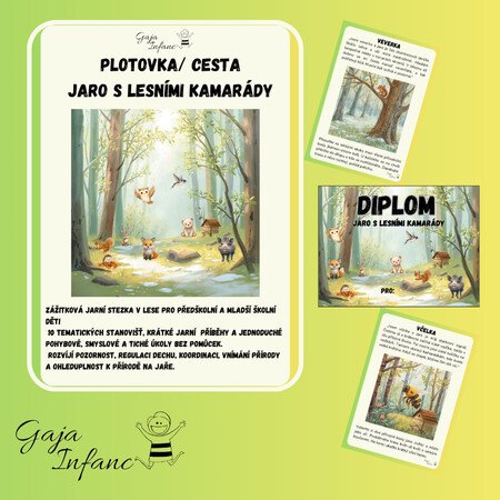 - příběhový text „Jaro v lese“: probouzení přírody, návrat ptáků, první květy, práce včel, jarní rytmus lesních zvířat – naladění na stezku a společné putování po stopách jara