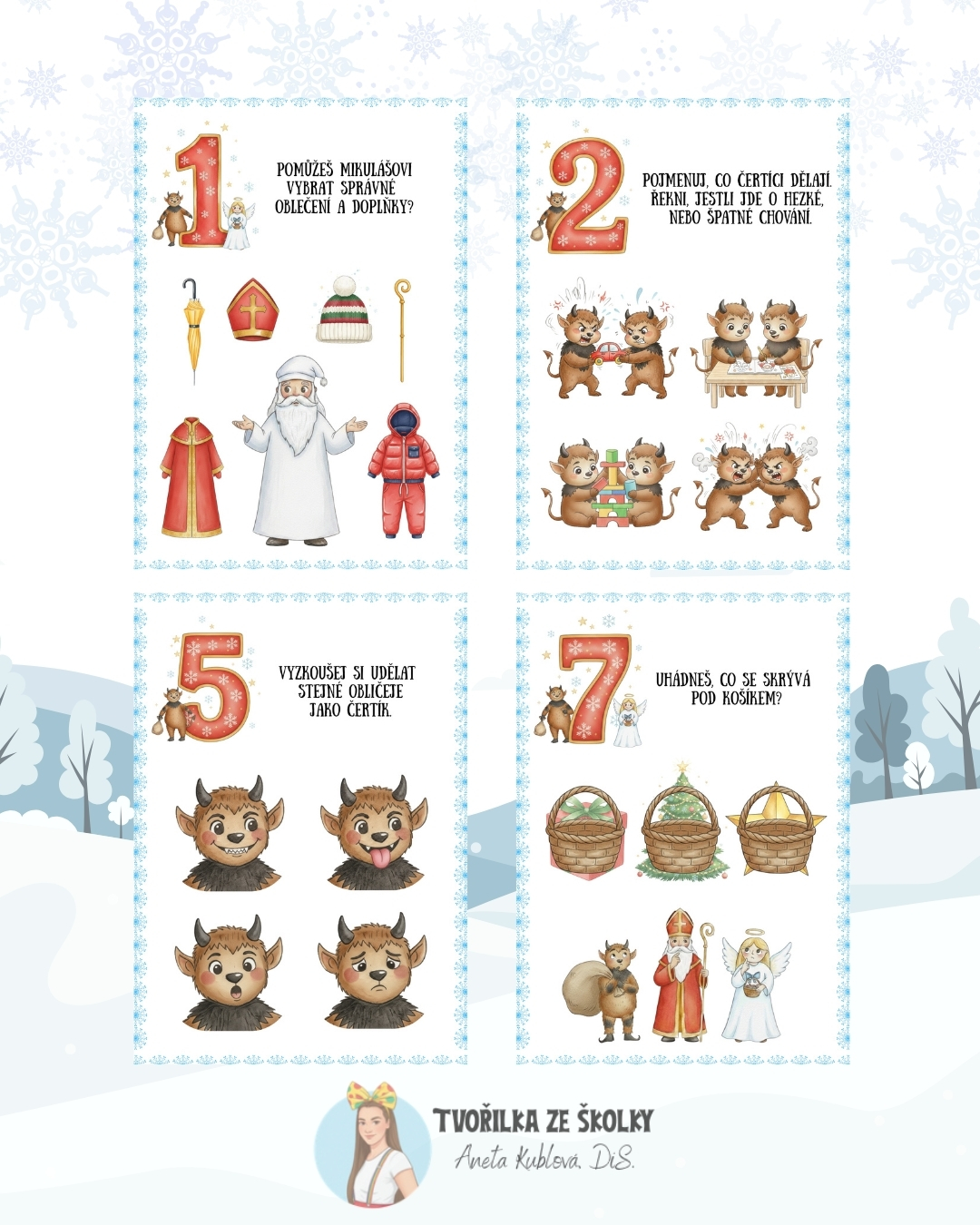 Děti provede Mikuláš i jeho pomocníci - budou poznávat stíny, hledat rozdíly, třídit zdravé potraviny, řešit cestu k pomocníkům, počítat stopy i zkoušet čertí grimasy.