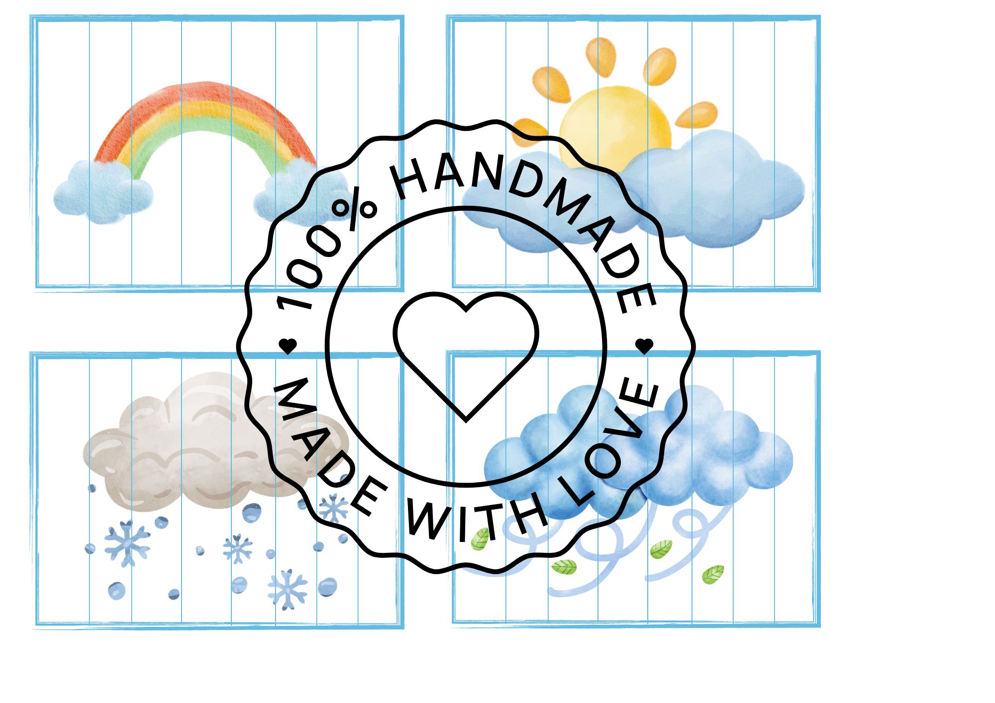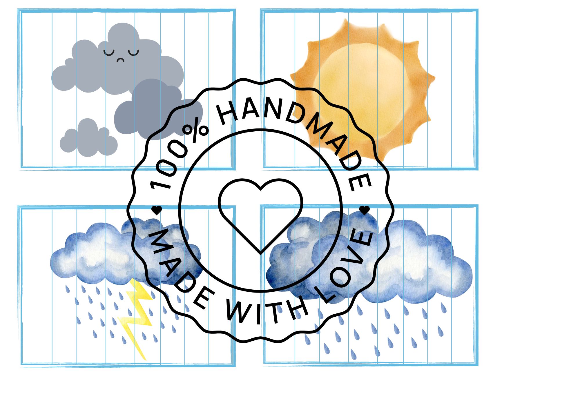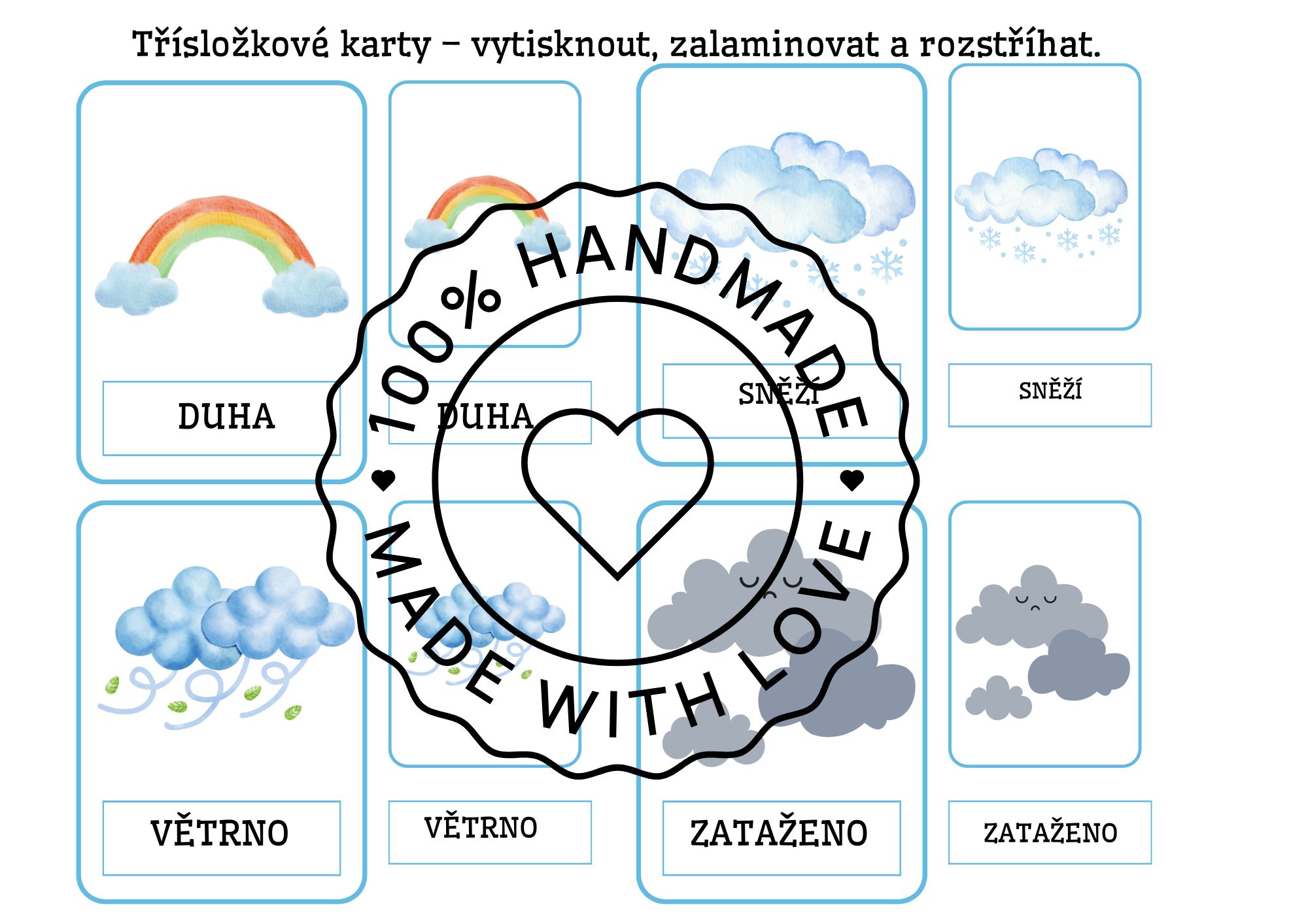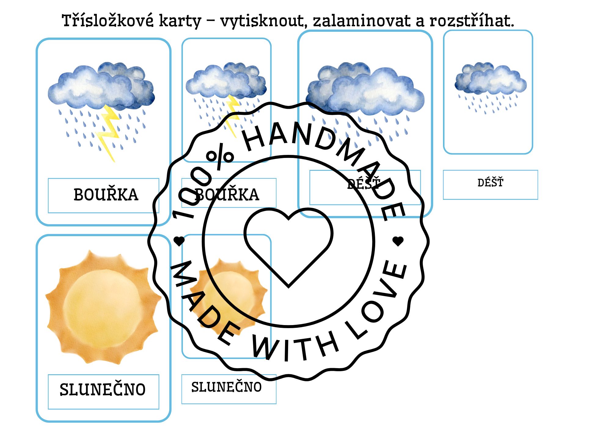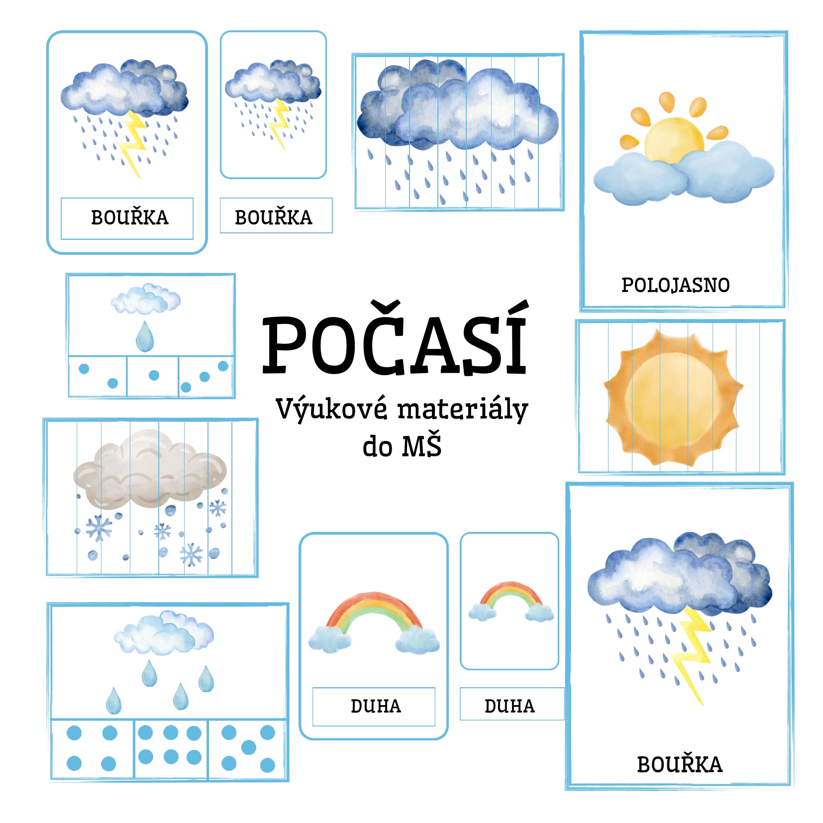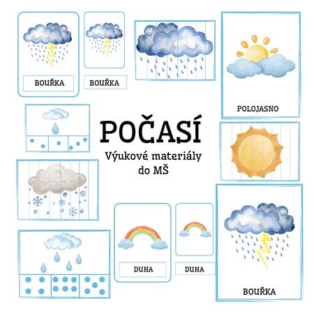 Tento materiál obsahuje demonstrační obrázky počasí 🌦️, skládanky z rozstříhaných obrázků ✂️, počítání kapiček 1–6 💧 a malé tříslovné karty 🃏. Stačí vytisknout, zalaminovat a použít jako ranní aktivitu, do komunitního kruhu nebo na samostatnou práci dětí 😊. Demonstrační kartičky se skvěle hodí i k povídání a vytleskávání v kruhu nebo jako výzdoba na nástěnku 🌈.