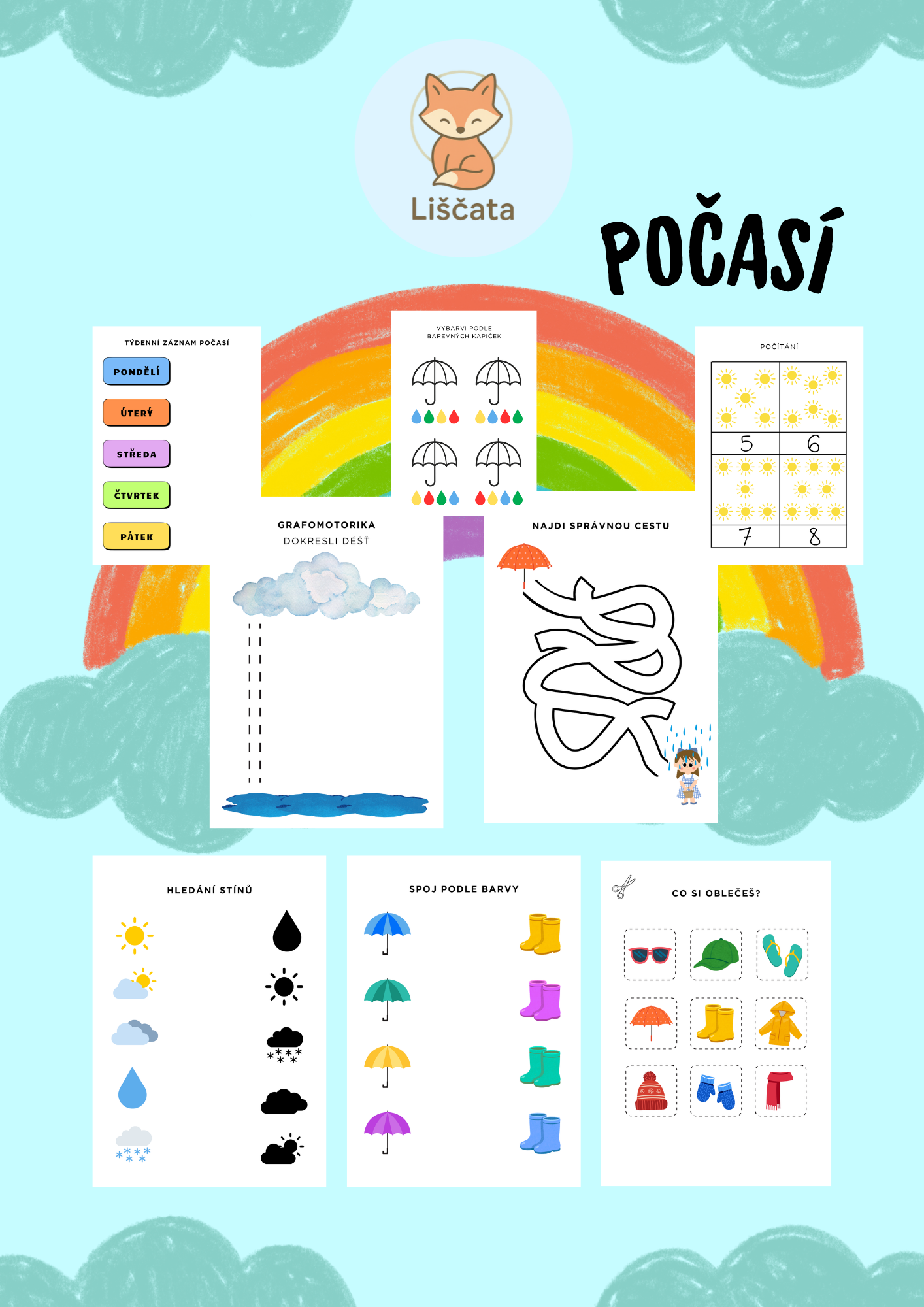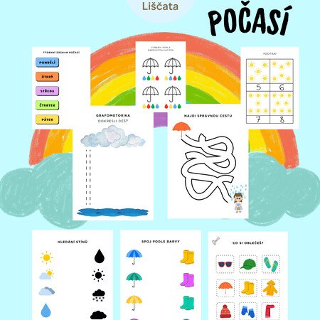 Materiály obsahují: demonstrační karty, omalovánky, aktivity na suchý zip, počítání, týdenní záznam počasí, velikosti, postřehové aktivity, pracovní listy, grafomotorika, provlékání, dot painting a další