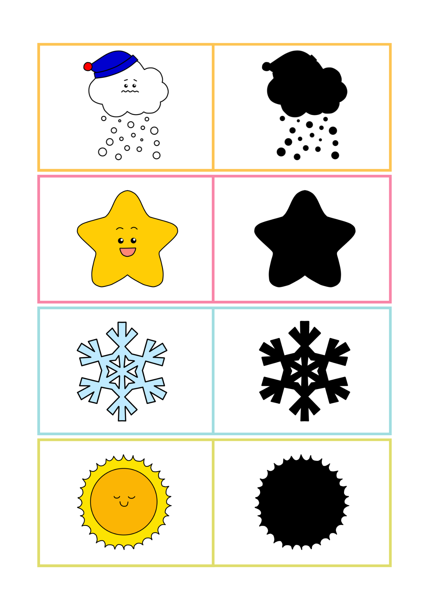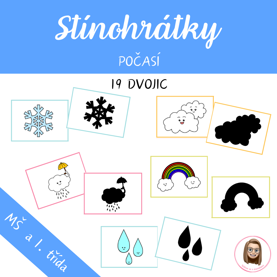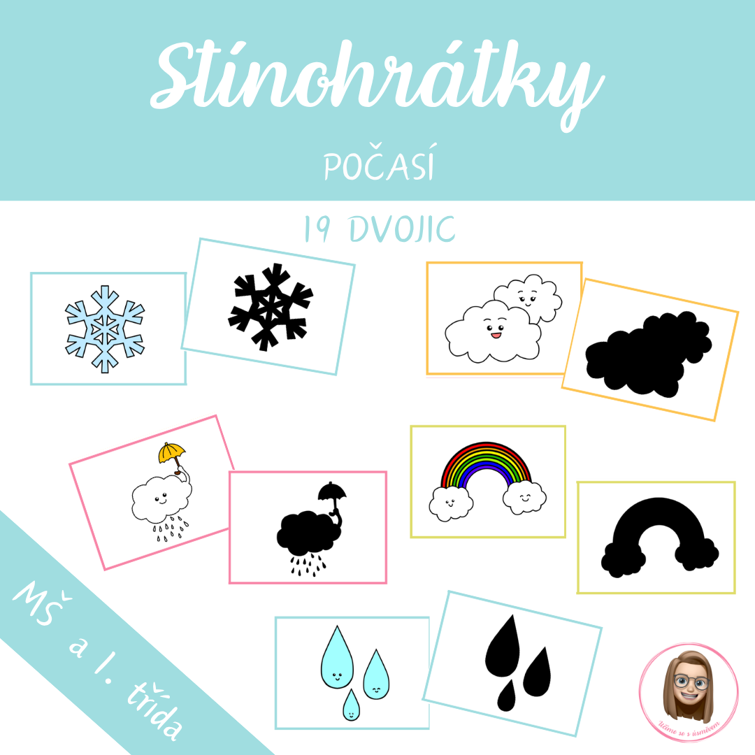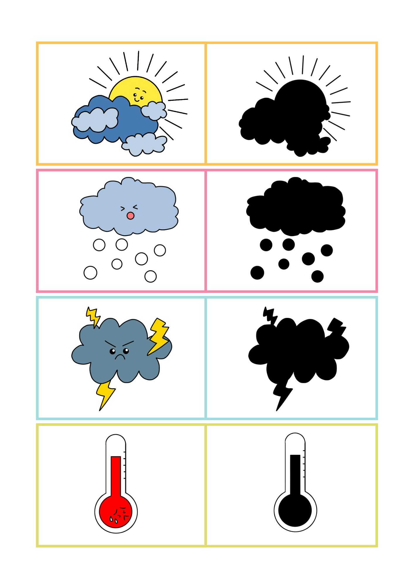 Zábavná sada aktivit, při které si děti procvičí zrakové vnímání, pozornost a slovní zásobu na téma počasí.