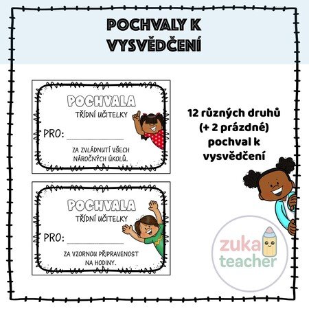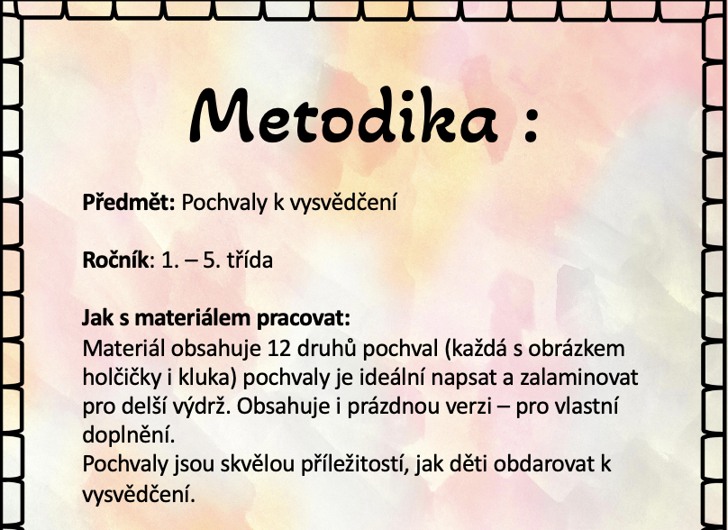 Materiál obsahuje 12 druhů pochval (každá s obrázkem holčičky i kluka) pochvaly je ideální napsat a zalaminovat pro delší výdrž. Obsahuje i prázdnou verzi – pro vlastní doplnění.