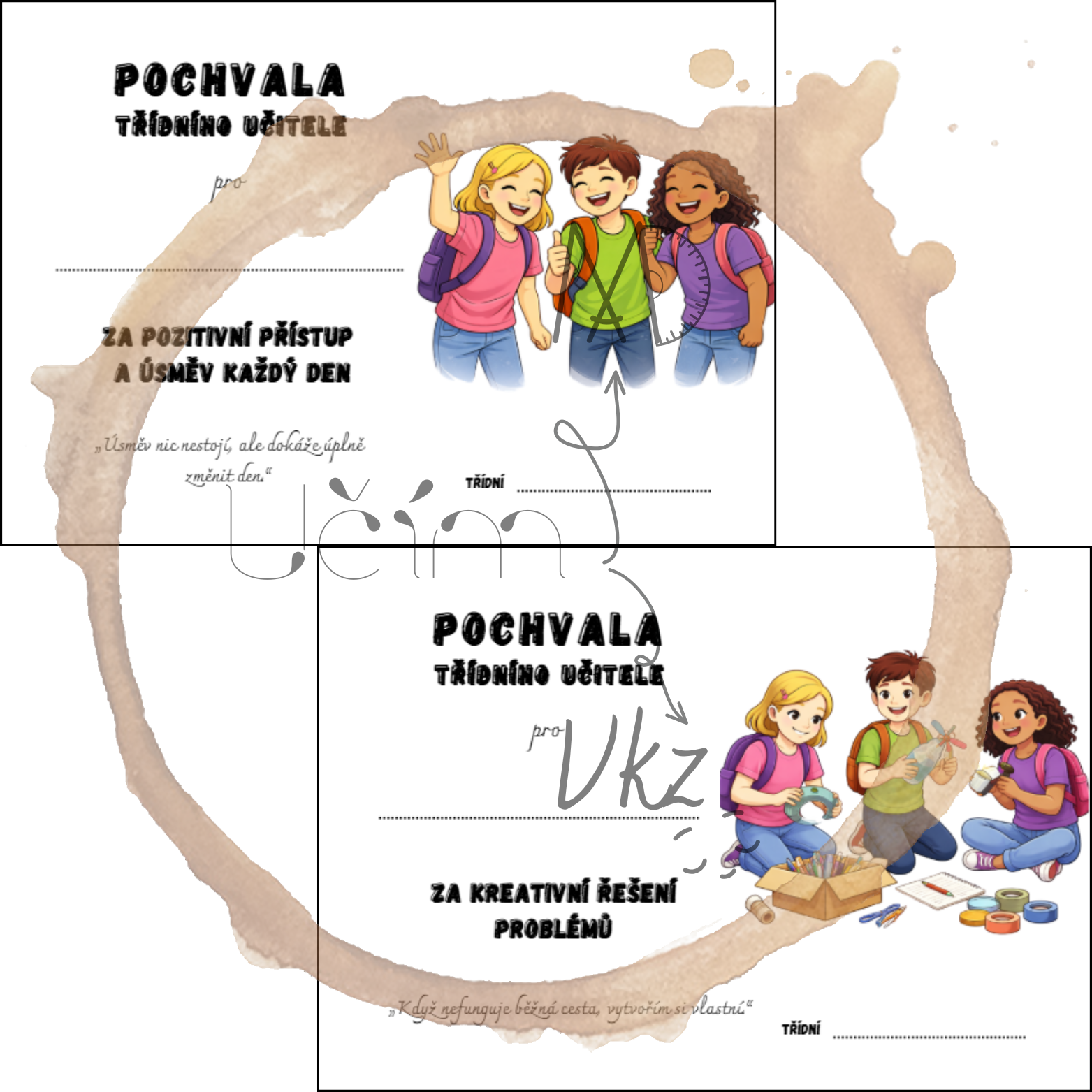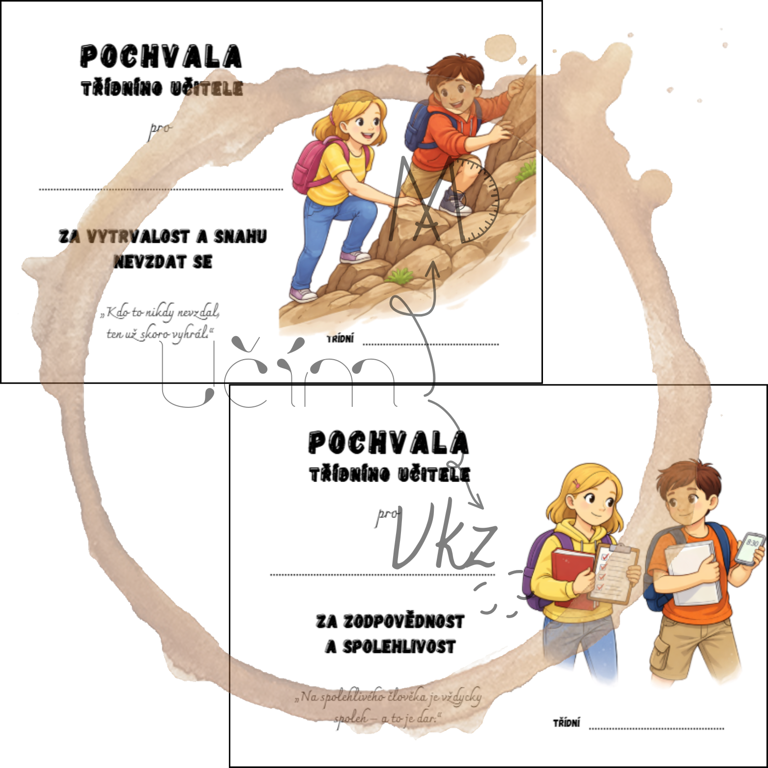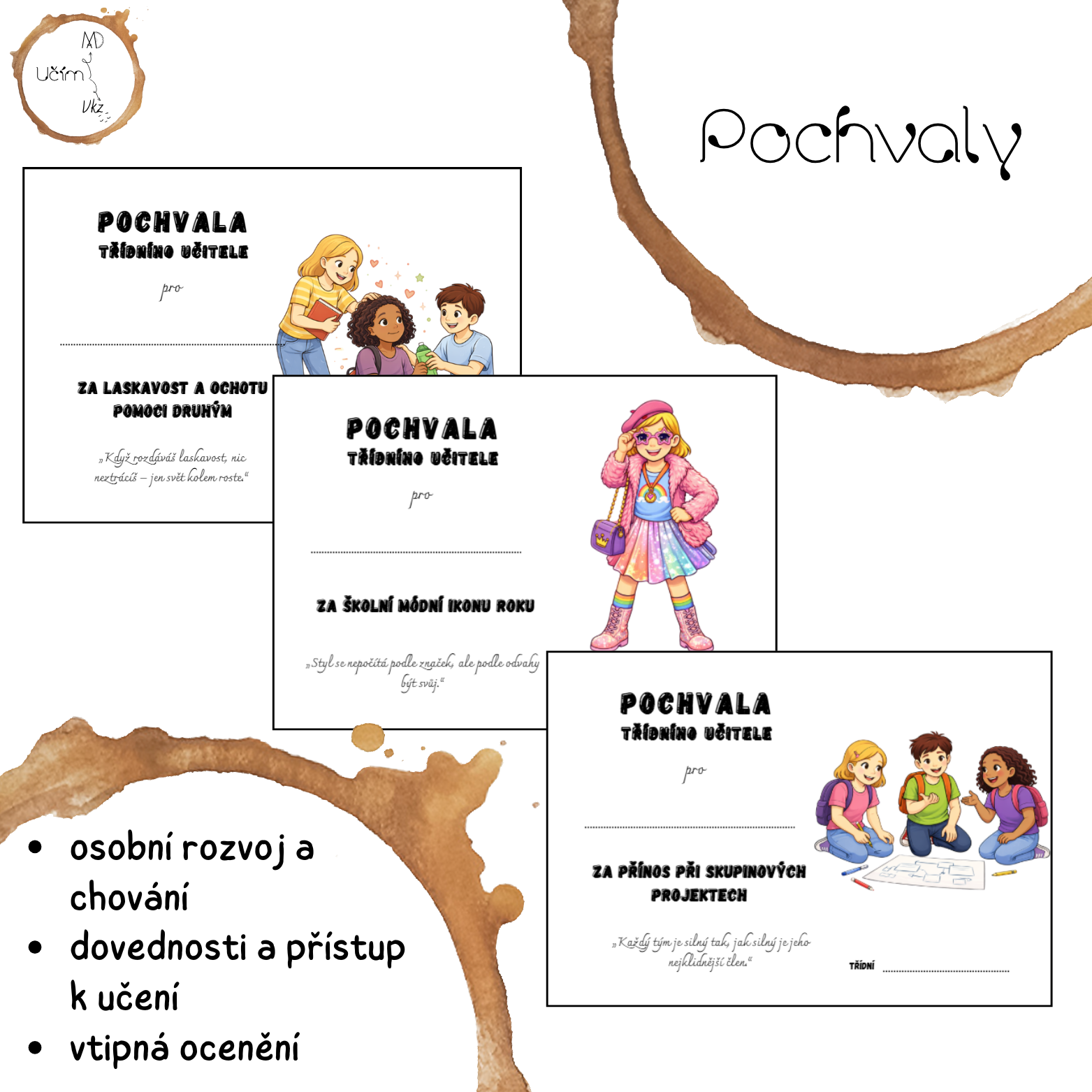 Pochvaly k vysvědčení pro 2. stupeň. Diplomy jsou rozděleny do skupin: osobní rozvoj a chování, dovednosti a přístup k učení, vtipná ocenění.