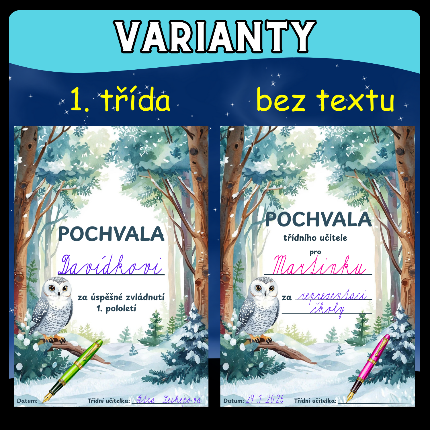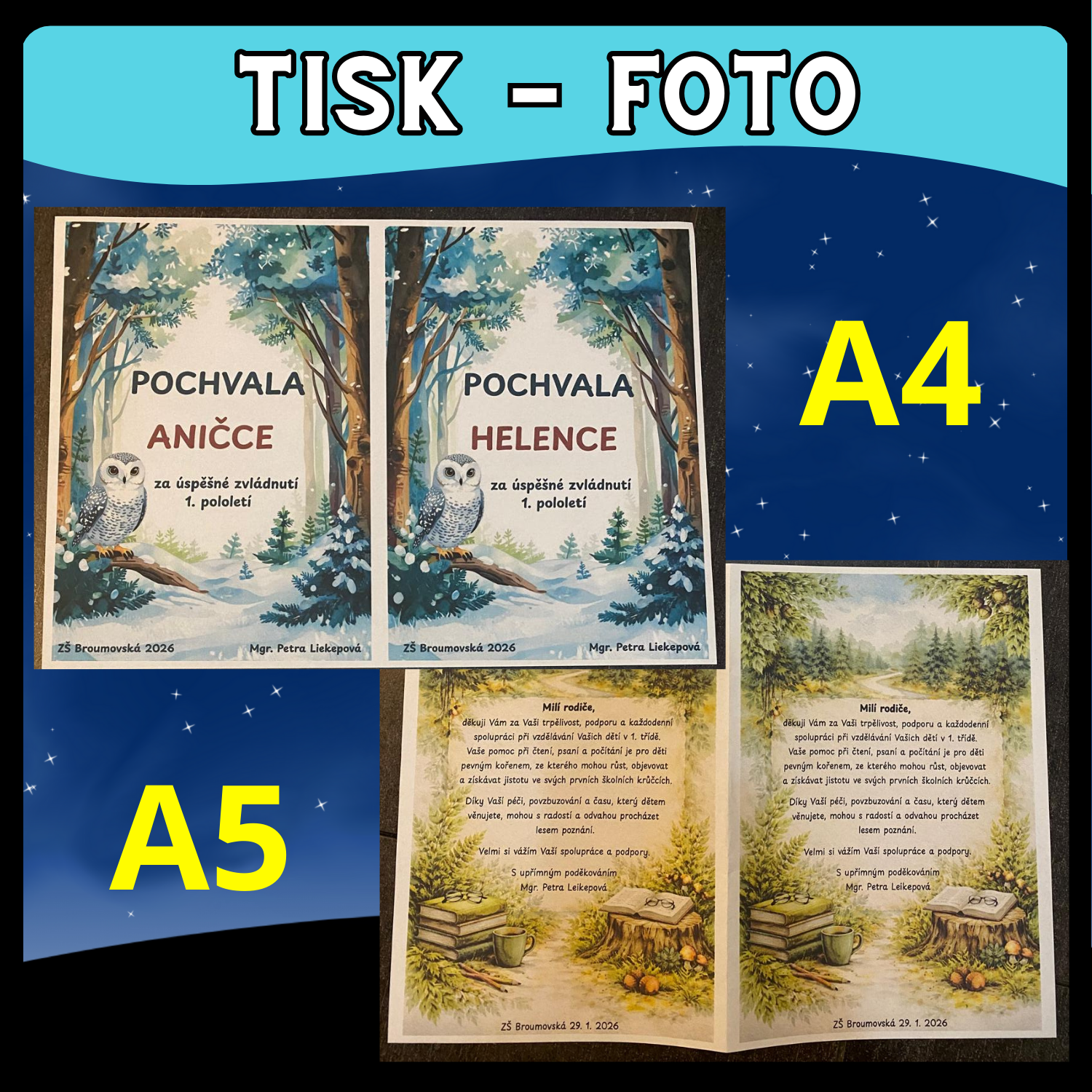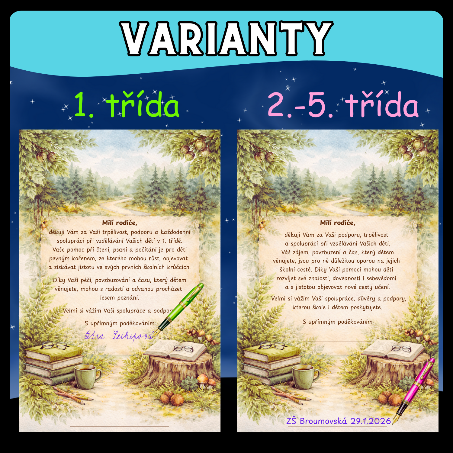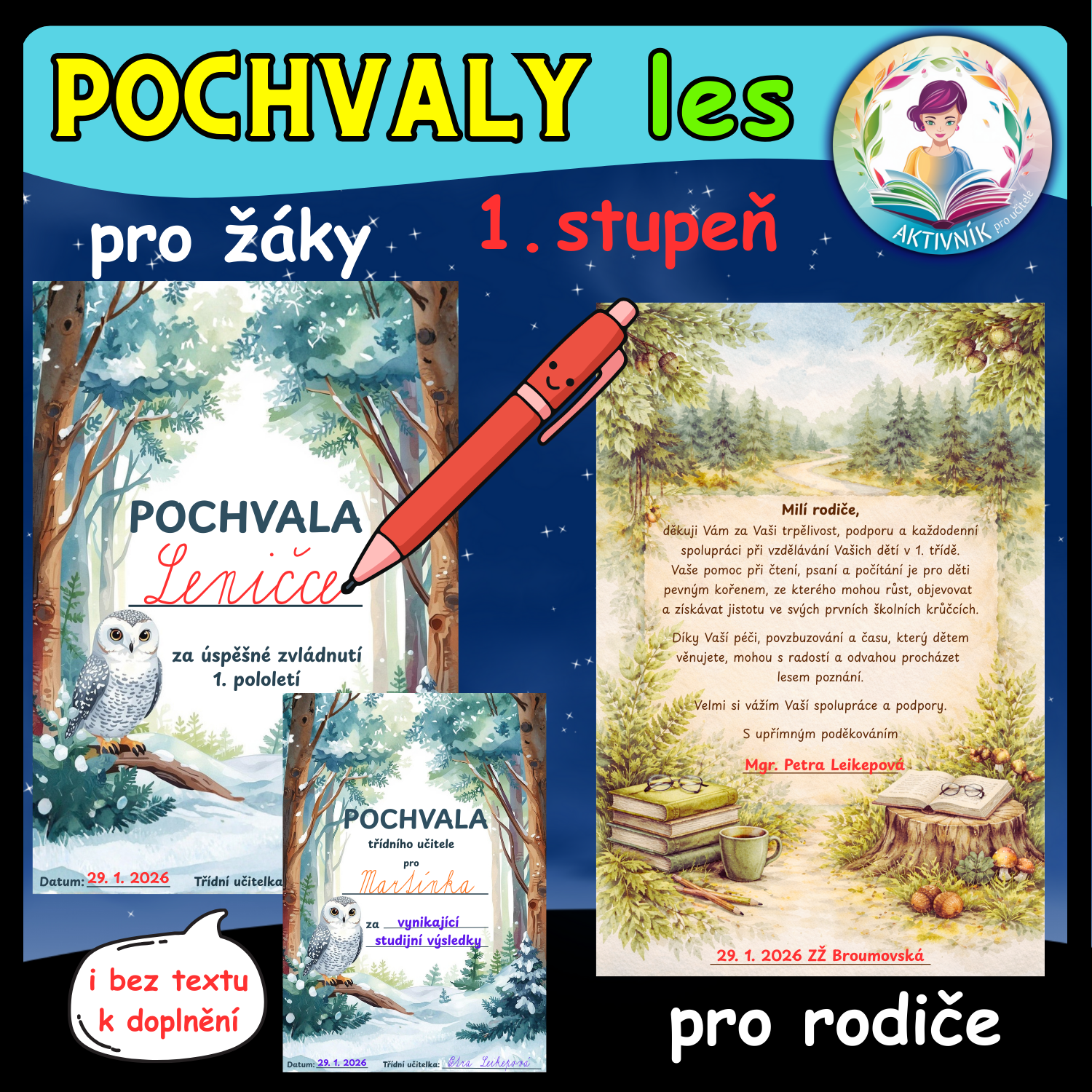 Materiál obsahuje pochvalu pro žáky a poděkování pro rodiče žáků základní školy (1. třída a 2.-5.třída). Najdete zde verzi s textem i bez. Vše s lesní tématikou. Připraveno pro tisk ve velikostech A4 a A5.