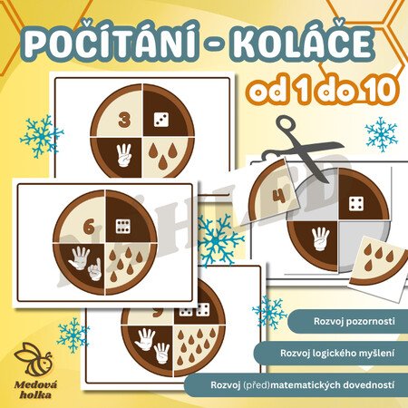 - 10 A4 - 10 koláčů s čísly - každý koláč je rozdělen na 4 kousky - úkolem dítěte je tyto 4 kousky spojit dohromady a poskládat celý koláč