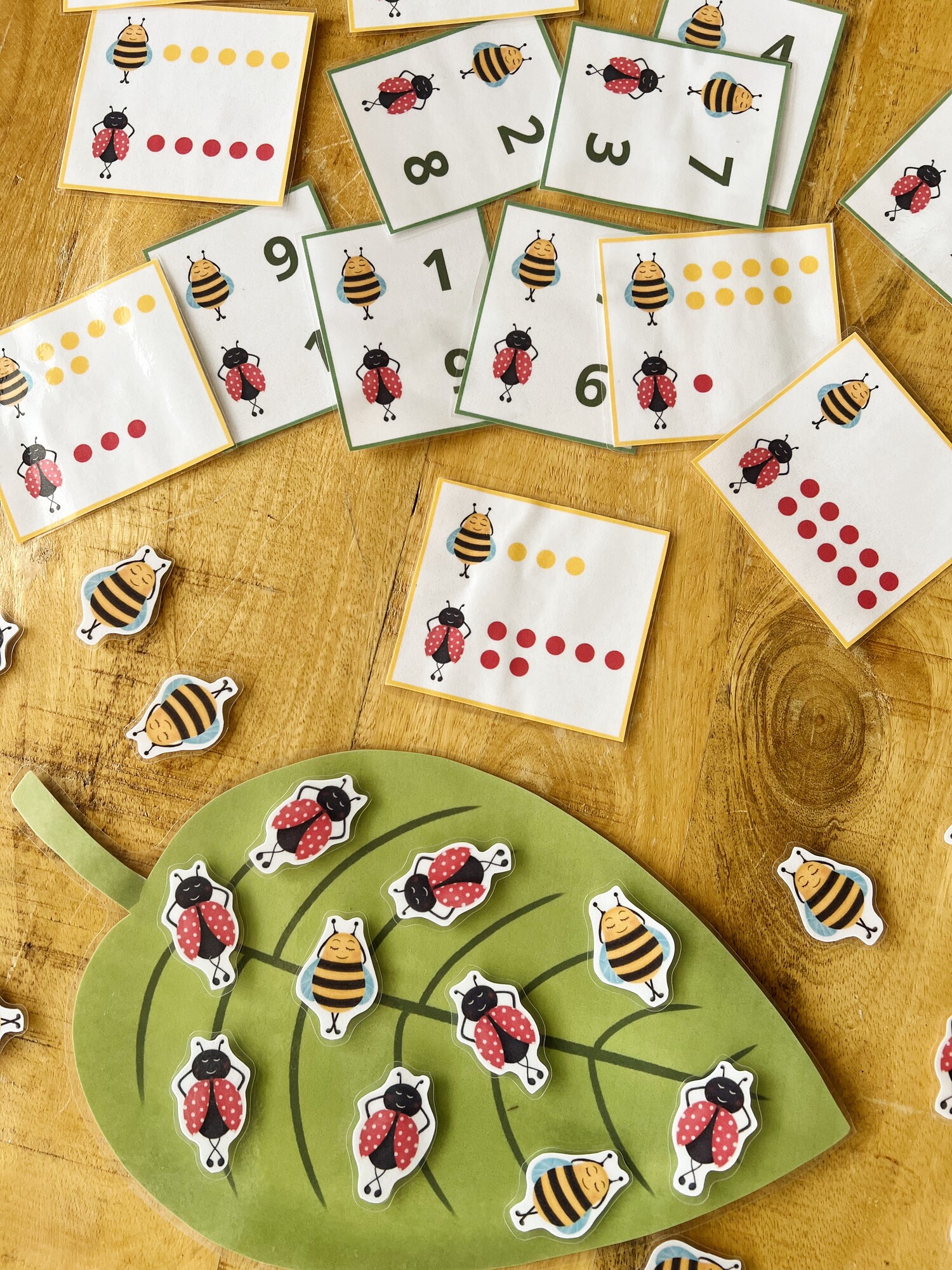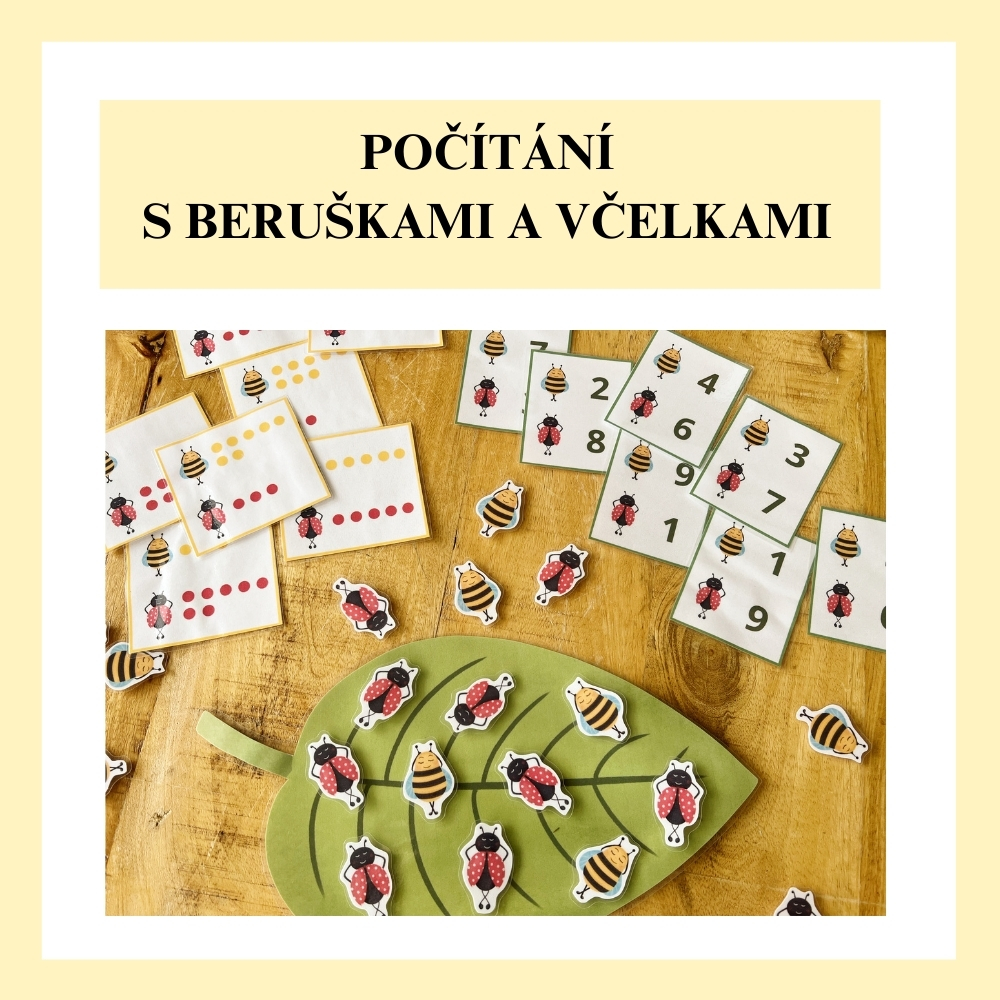 Možnosti využití: Materiál je variabilní. Pro mladší děti využijte karty s puntíky (vizuální opora), pro starší předškoláky, nebo malé školáky karty s číslicemi. Vystřižené dílky jsou ideální i pro smyslové boxy (sensory play) – např. hledání hmyzu v zelené rýži, čočce či jiném sypkém materiálu.