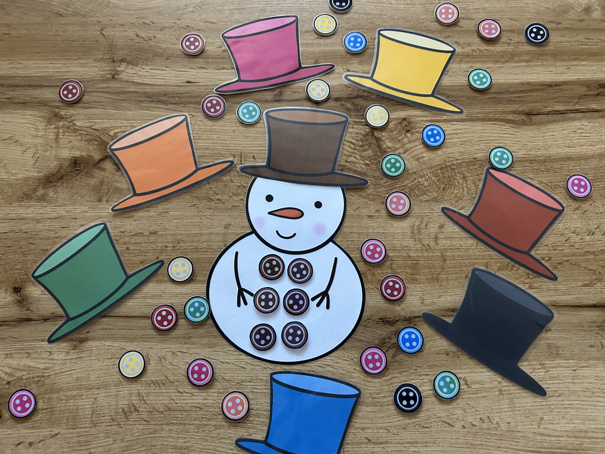 Základem souboru je sněhulák formátu A4 se 6 místy pro knoflíky, na které děti pomocí suchého zipu připevňují barevné knoflíky. Jednotlivé aktivity jsou navrženy tak, aby byly přehledné, snadno pochopitelné a vhodné pro individuální i skupinovou práci.