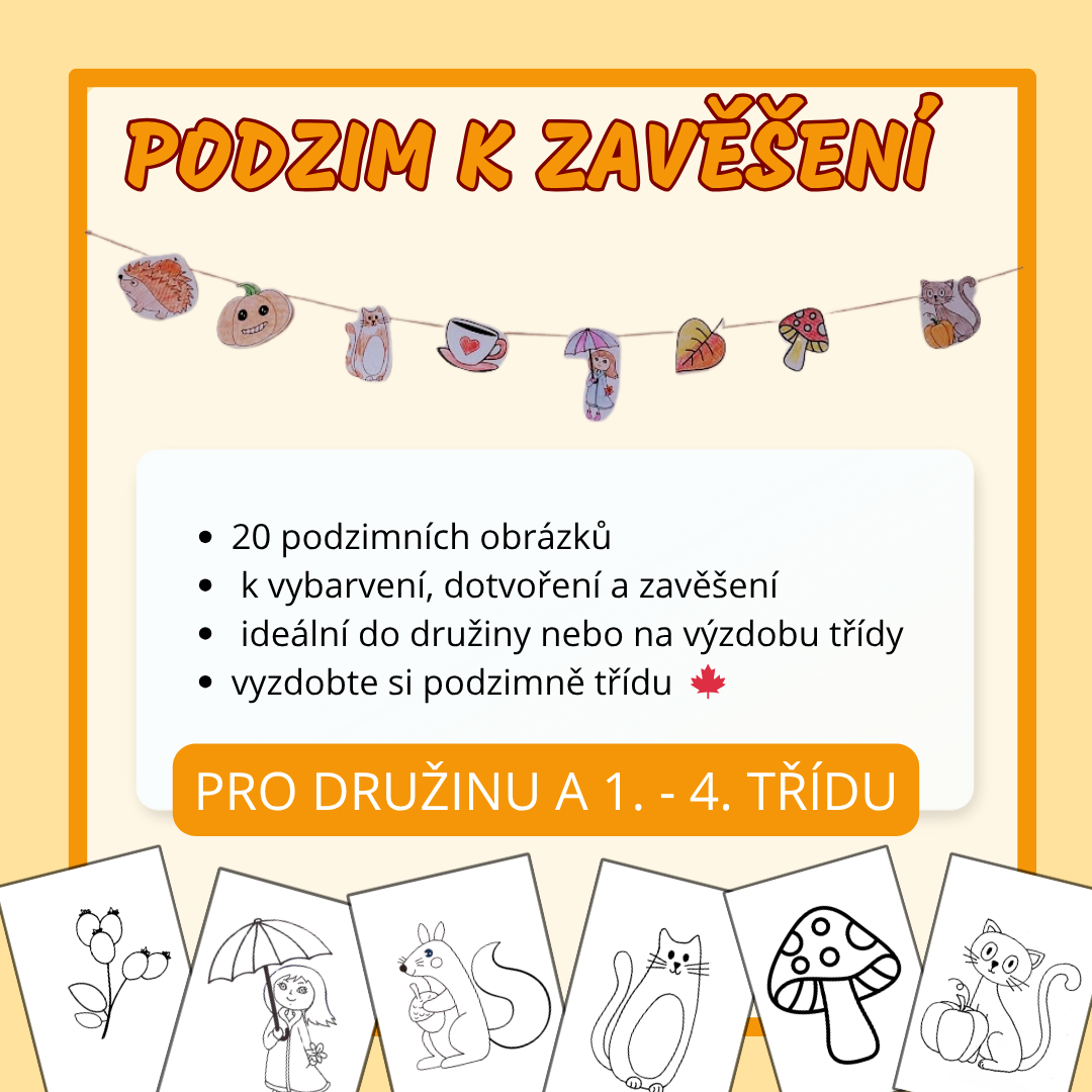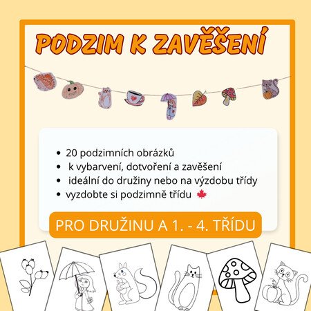 Podzim k zavěšení 🍁 20 podzimních obrázků k vybarvení, vystřižení a zavěšení jako girlanda. Rychlá a hravá výzdoba pro 1.–4. třídu. Stačí vytisknout a můžete tvořit.