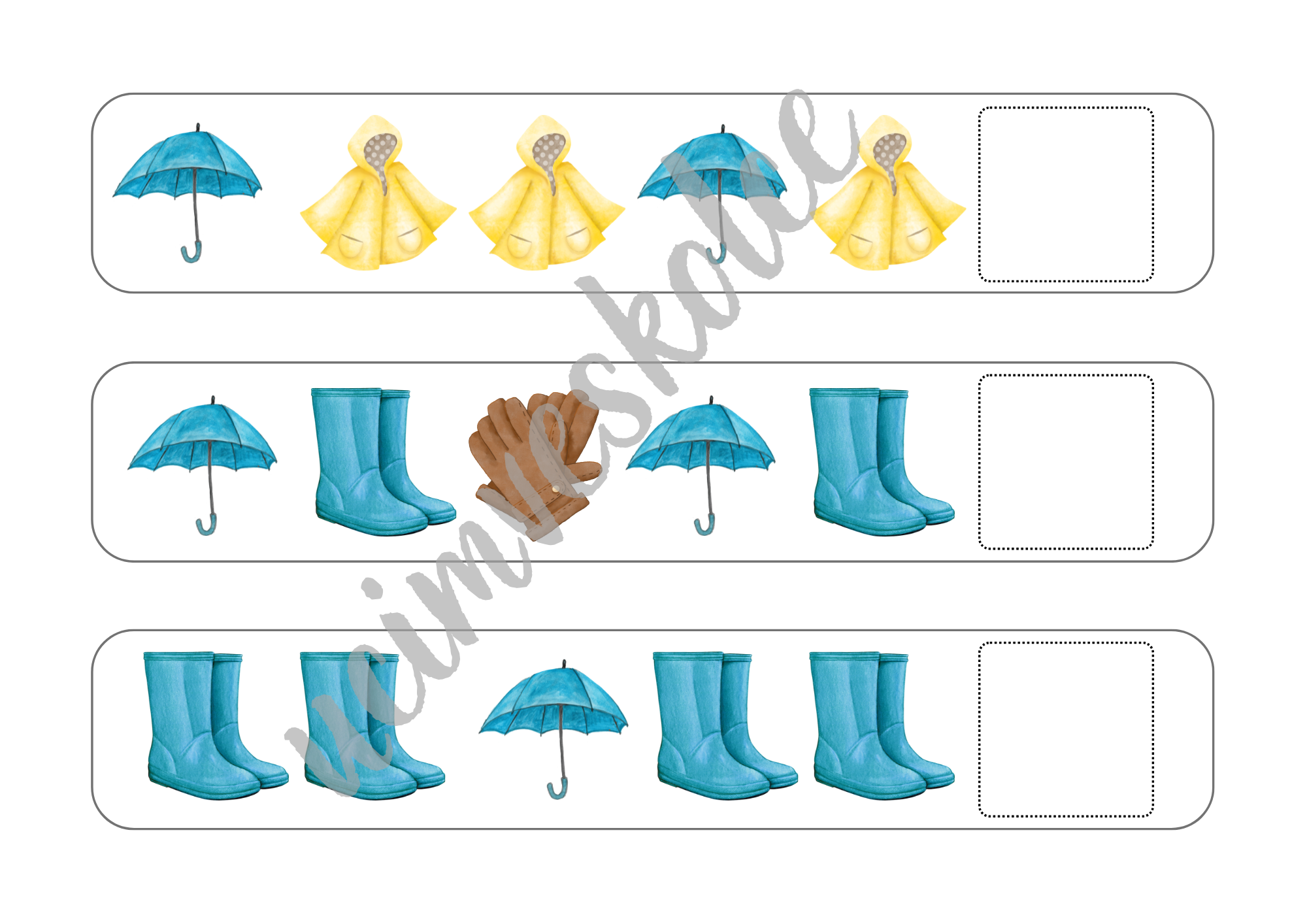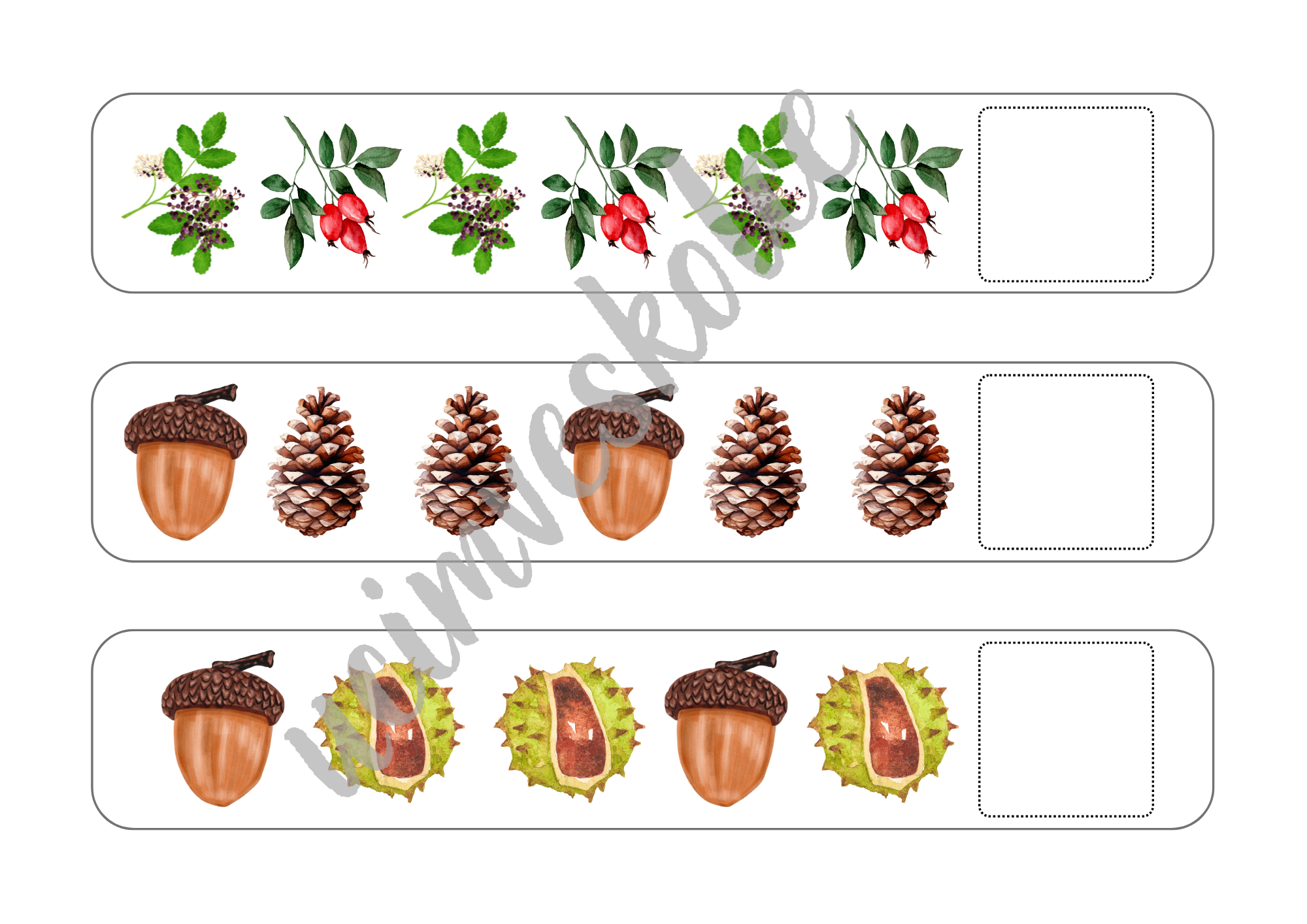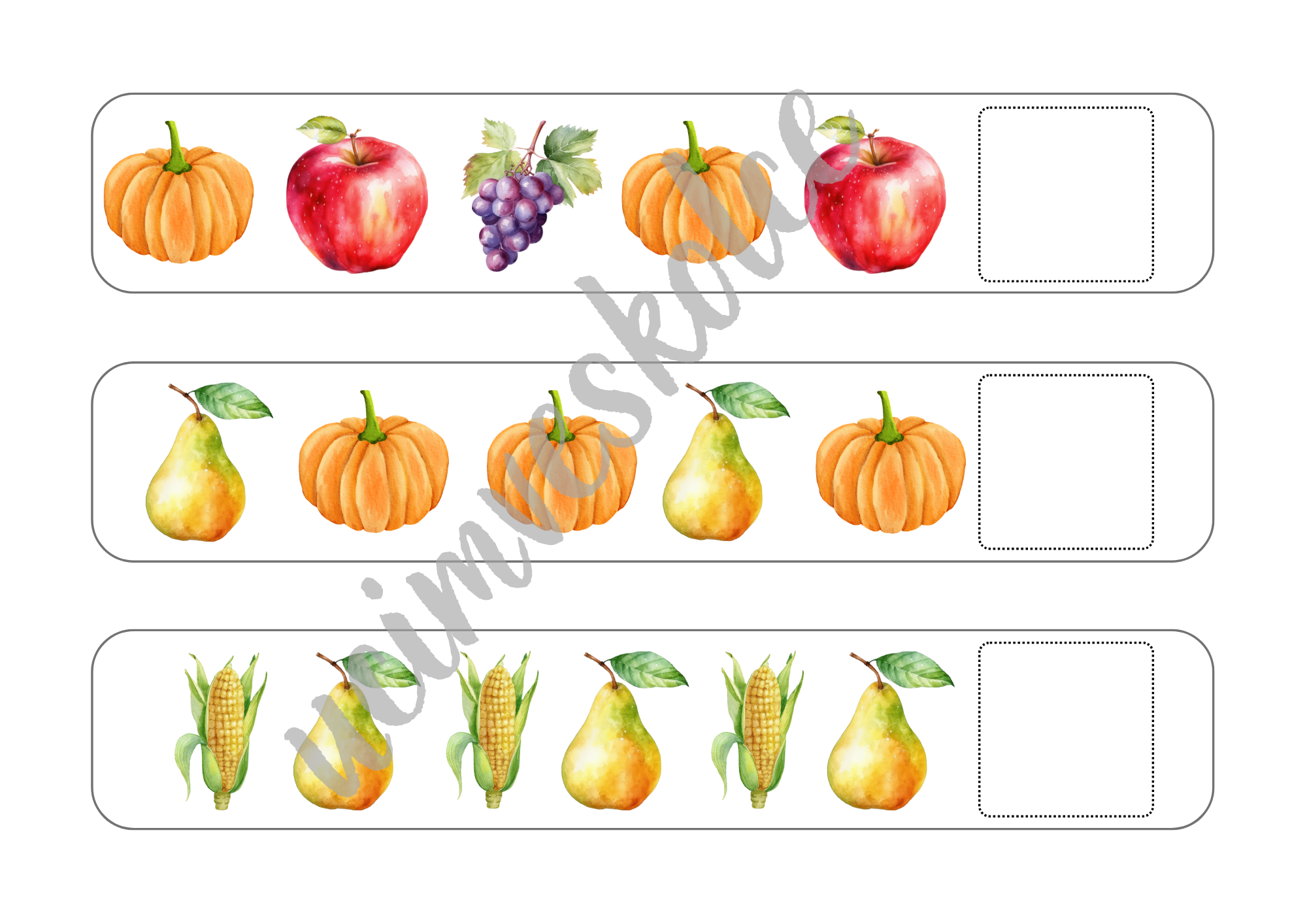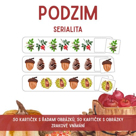Soubor obsahuje 50 dlouhých kartiček s řadou obrázků a 50 malých kartiček s obrázky.Který obrázek patří na konec každé řady?Úkolem dětí je najít a přiložit na konec řady na dlouhé kartičce tu správnou kartičku s obrázkem.Aktivita je vhodná pro využití v MŠ.Prostřednictvím této aktivity u dětí rozvíjíte schopnost seriality (posloupnosti).K připevnění malých kartiček můžete použít samolepicí suchý zip - s materiálem se bude dětem lépe manipulovat a bude se Vám také lépe uchovávat.
