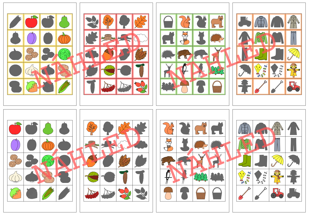 Materiál obsahuje čtyři strany s kartičkami domina (1 strana = 1 sada kartiček domina = 10 kartiček) a čtyři strany s kartičkami pexesa (40 dvojic). Tématem je podzim.