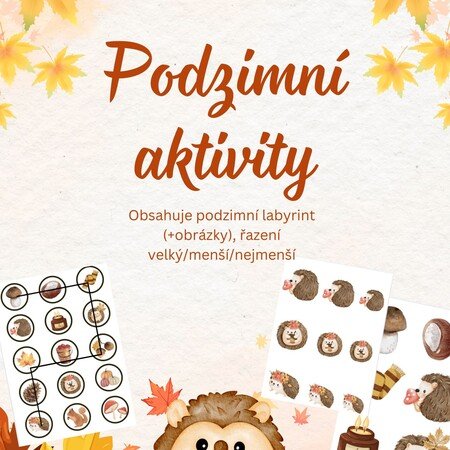 Zábavný podzimní soubor aktivit pro děti – obsahuje labyrint s podzimními obrázky a cvičení na porovnávání velikostí (velký–menší–nejmenší). Vhodné pro rozvoj logického myšlení, pozornosti a slovní zásoby. Ideální pro mateřské školy nebo první stupeň základní školy.
