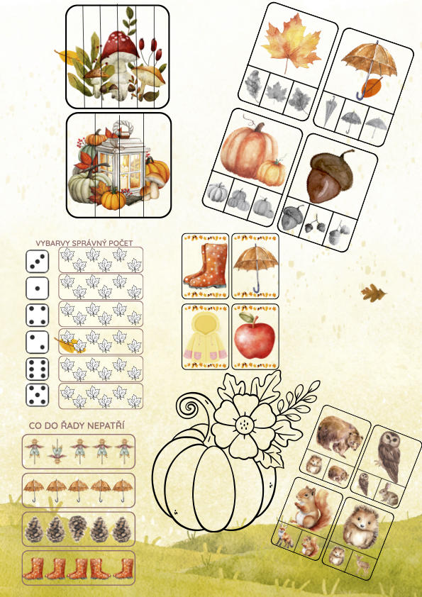 Soubor obsahujedemonstrační kartičkykolíčkování (lehčí a těžší verze)obrázkové puzzlepracovní listy 6xomalovánky