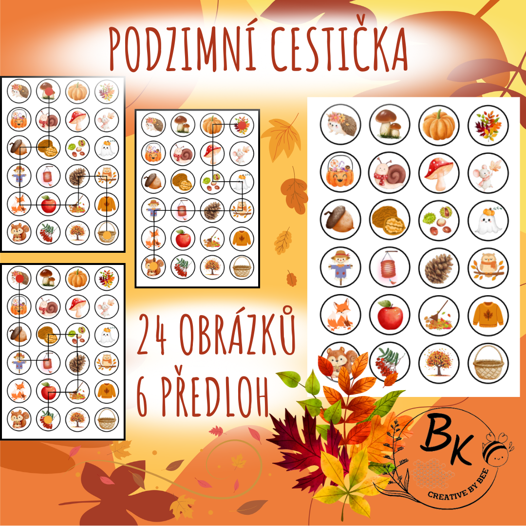 Soubor obsahuje 24 velkých podzimních obrázků, 6 karet s vyznačenými cestičkami a jednu kartu pro vlastní cestičku.