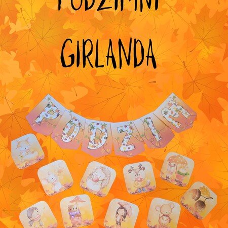 Najdete zde barevnou girlandu (vlaječky) s písmeny PODZIM a doprovodné tematické obrázky. Obrázky lze na šňůru připevnit pomocí sešívačky, kolíčků či lepicí pásky. Doprovodné obrázky můžete rozmístit okolo girlandy na každou stranu. Zavěste na obložky, na stěnu, na dveře, do okna, na nástěnku nebo tabuli.