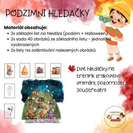 Zábavná aktivita pro trénink postřehu a pozornosti! Děti hledají obrázky s podzimní a halloweenskou tematikou podle kartiček nebo seznamu, mohou i soutěžit v běhací variantě. Pomůcka rozvíjí zrakové vnímání a orientaci na ploše.