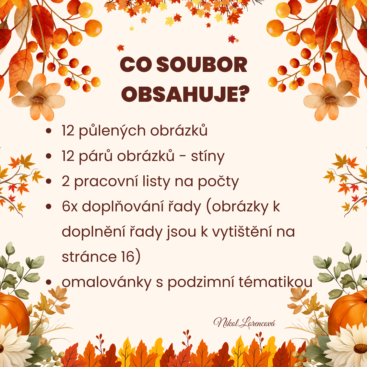 Materiál je ideální pro samostatnou práci dětí, práci ve dvojicích, skupinové aktivity, nebo jako doplněk do center aktivit či tematických týdnů s podzimní tematikou.