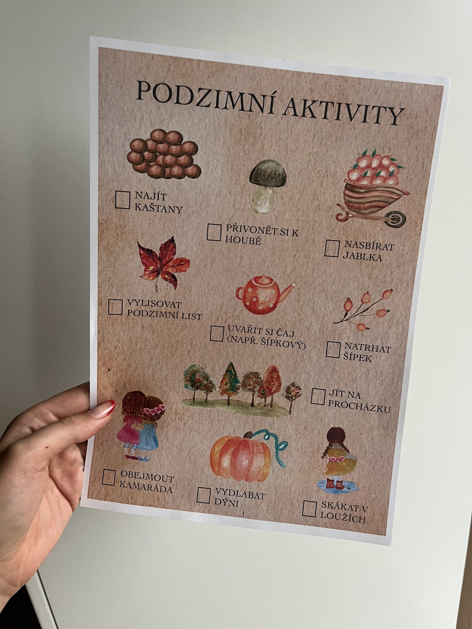 V souboru dále můžete najít plakát s podzimními aktivitami, který můžete vytisknout a dát například na nástěnku pro inspiraci rodičů nebo na tabuli (s dětmi pak lze aktivity po splnění odškrtávat).