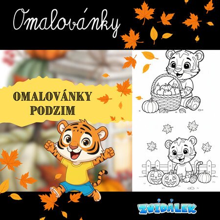 Tématické omalovánky tygříka Zvídálka. Zvídálek a typicky podzimní prostředí. Zdarma ke stažení.