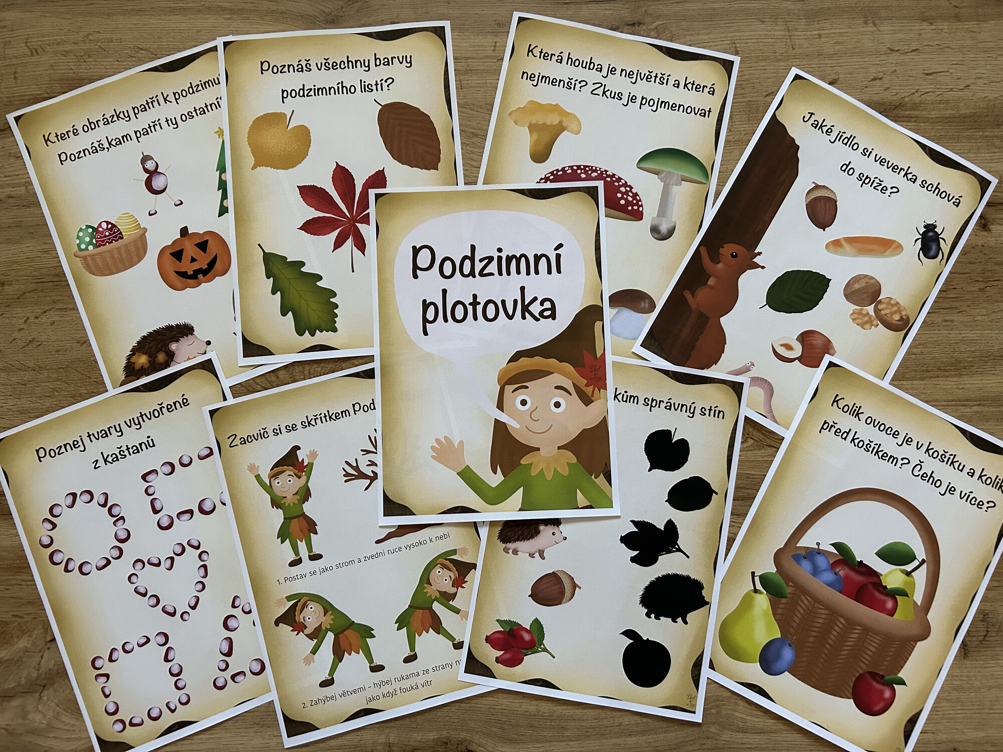 - 10 připravených úkolů k vytisknutí – hravé, tematicky laděné na podzim (např. listí, ježci, dýně, vítr či houby).