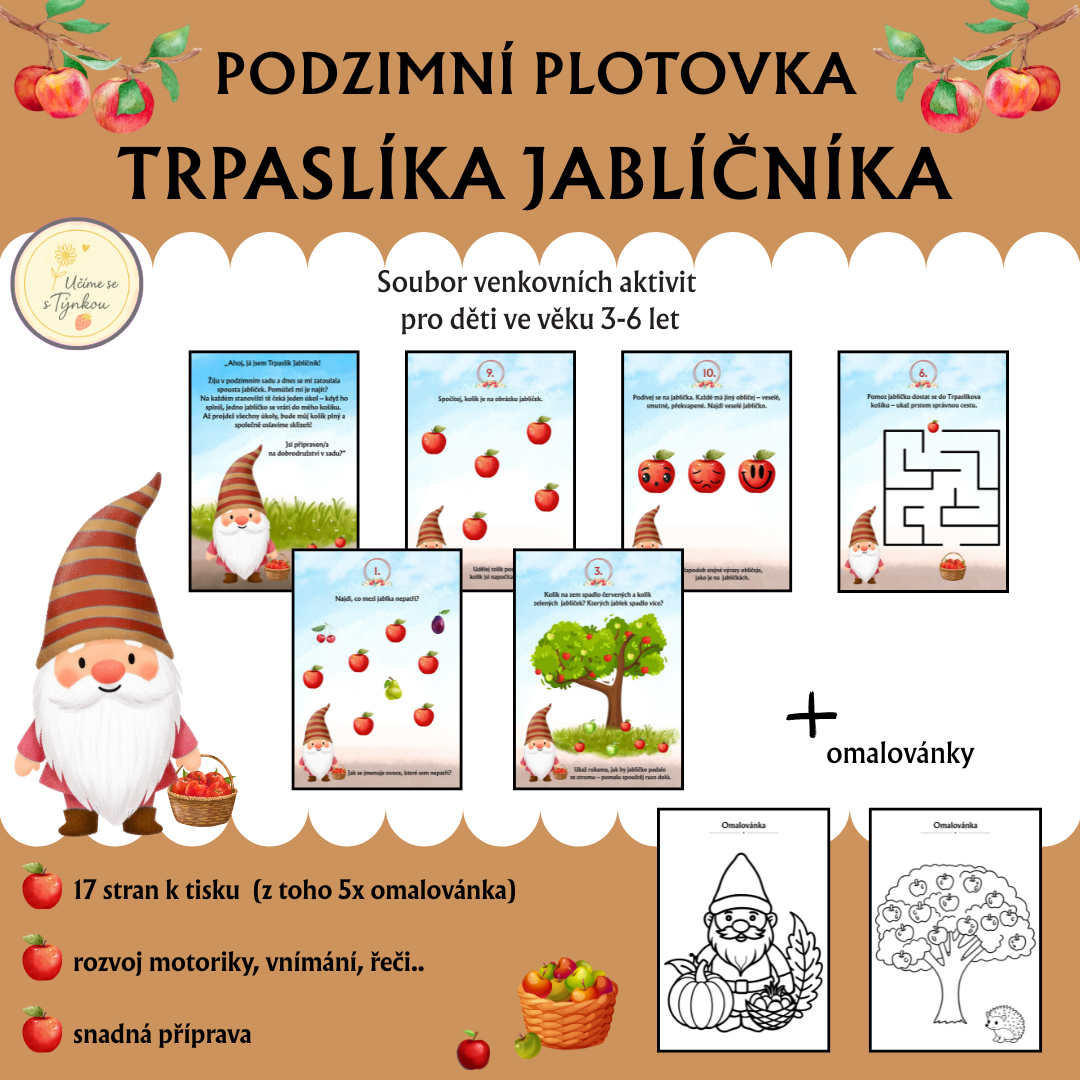 Tato plotovka byla vytvořena jako hravý způsob, jak dětem zpestřit podzimní dny a zároveň je nenásilně rozvíjet v různých oblastech. Průvodcem je malý a zvídavý Trpaslík Jablíčník, který potřebuje pomoc dětí při sbírání jablek v podzimním sadu.
