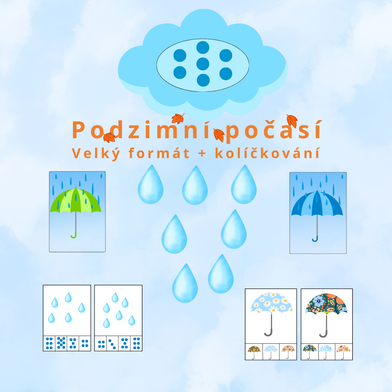 Soubor obsahuje: úvodní list, 16 + 16 karet k vyhledávání dvojic ve dvou velikostech - pro duplicitní karty je třeba vytisknout 2x, 8 karet pro určování počtu - kolíčkování, 8 karet pro vyhledávání stejného vzoru - kolíčkování, 6 obrázků mraků se zadaným počtem (formát A5) + 1 stránka A4 s kapkami k doplnění - je třeba vytisknout vícekrát