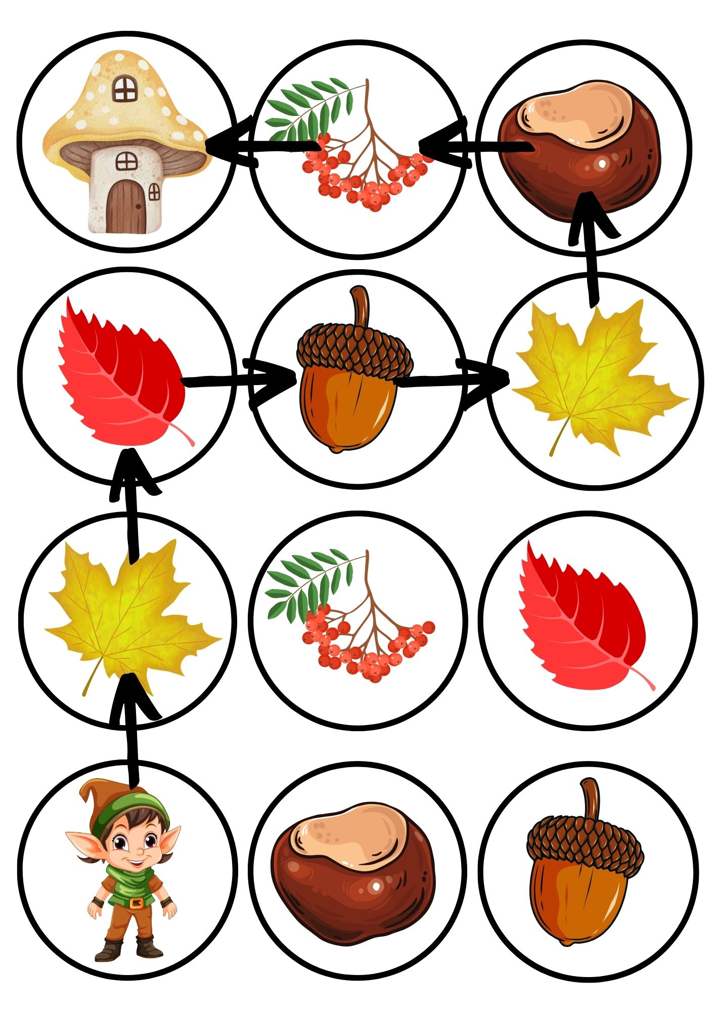 V tomto materiálu si procvičíte prostorovou orientaci, zrakové vnímání, pozornost. Jak pracovat s materiálem? Vytiskněte velká kolečka, vystřihněte a zalaminujte. Rozložte podle předlohy. Děti poté podle mapy mají za úkol dovést skřítka Podzimníčka domů. Obsahuje 12 koleček, 8 map.