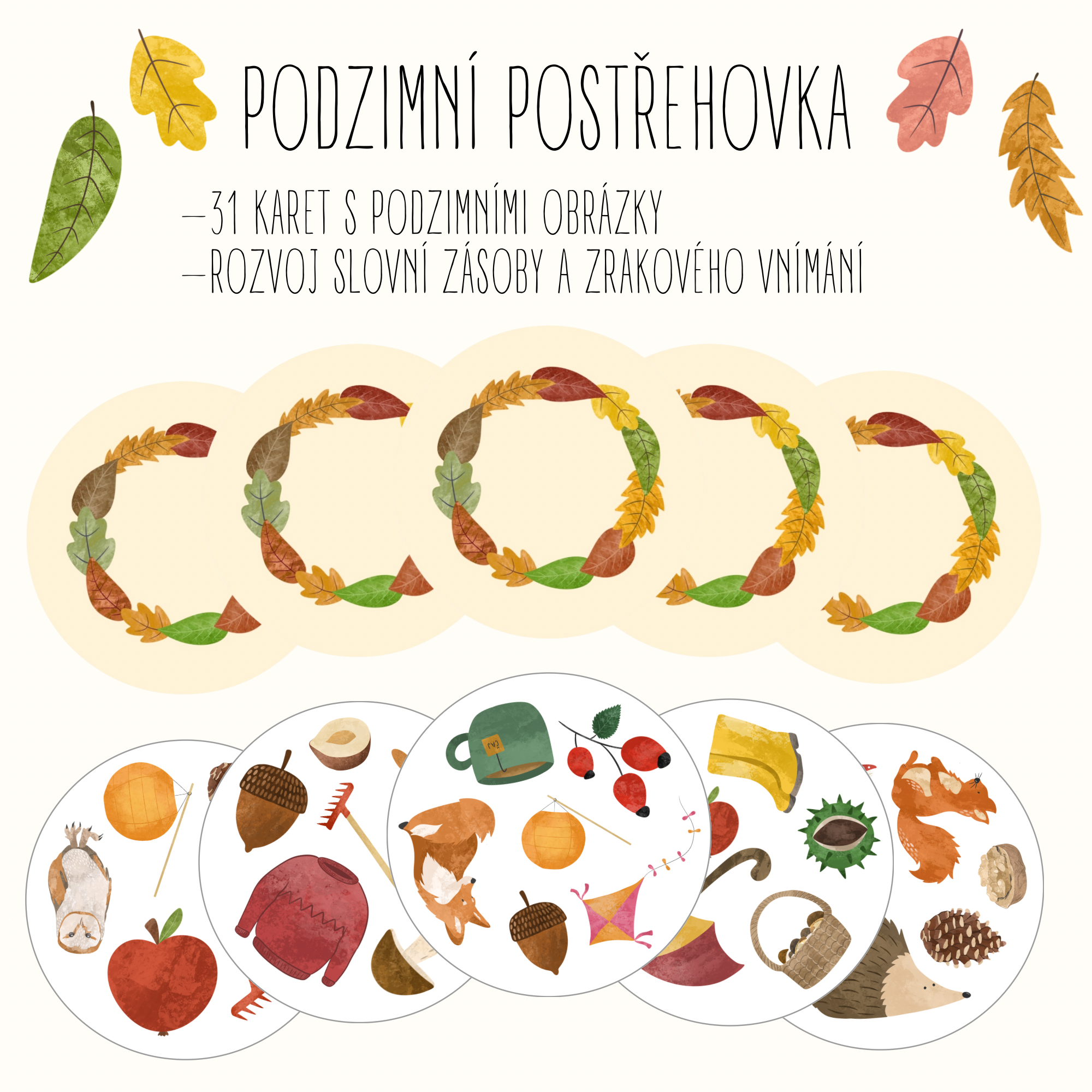 Obsahuje 31 karet, na každé kartě je 6 podzimních obrázků. 🍁