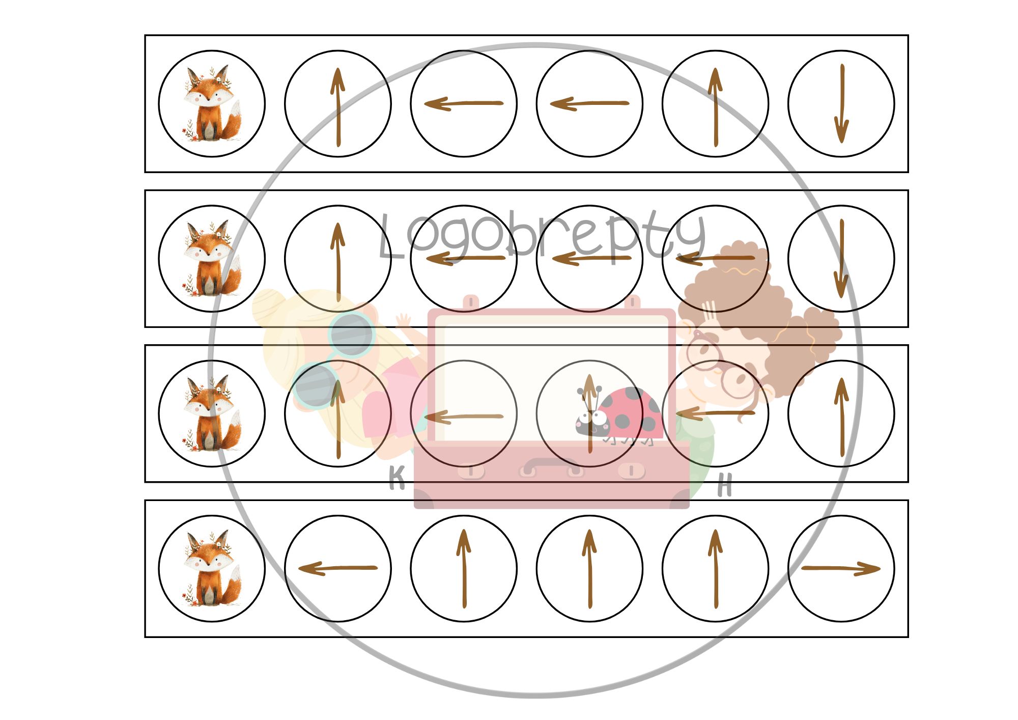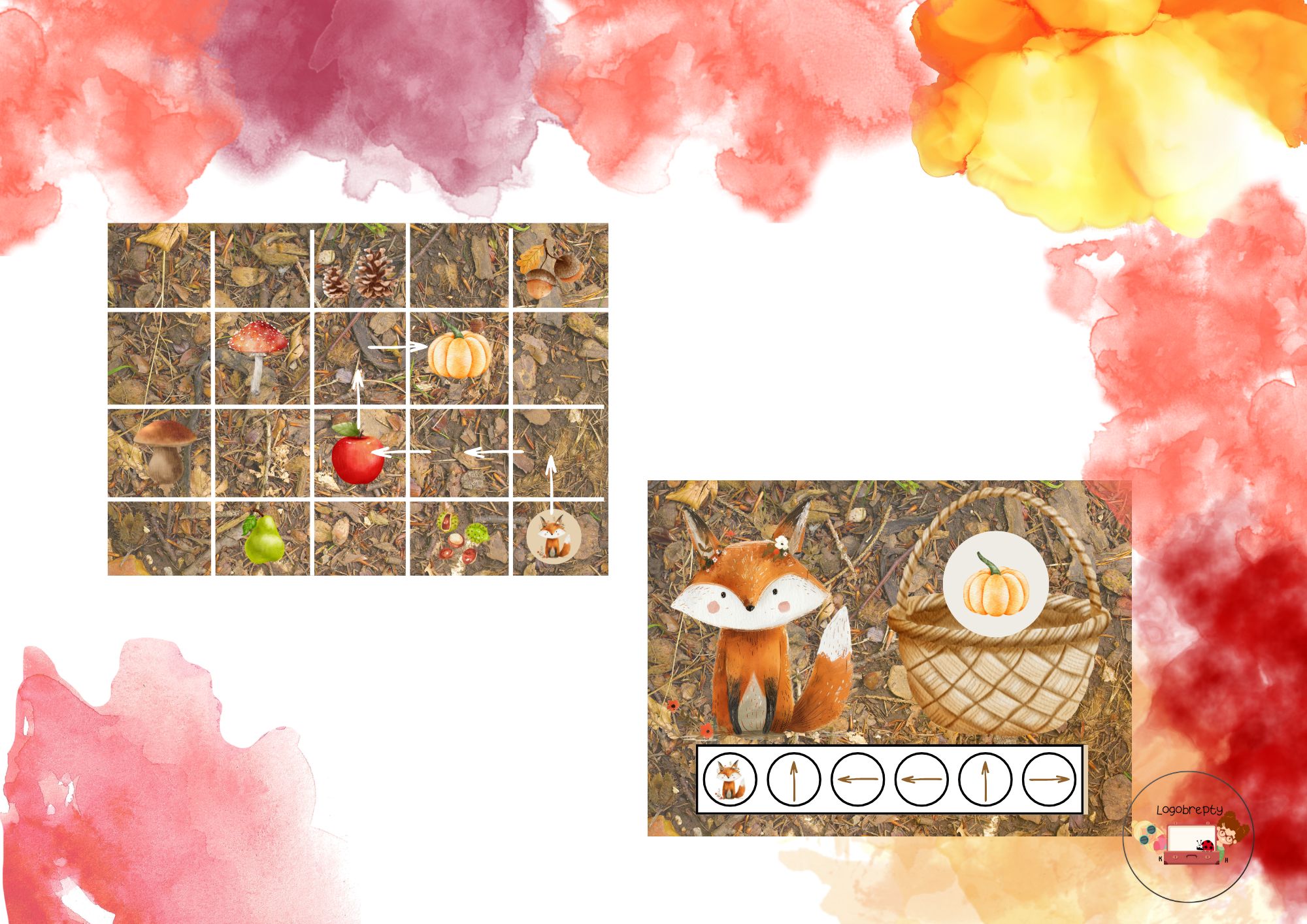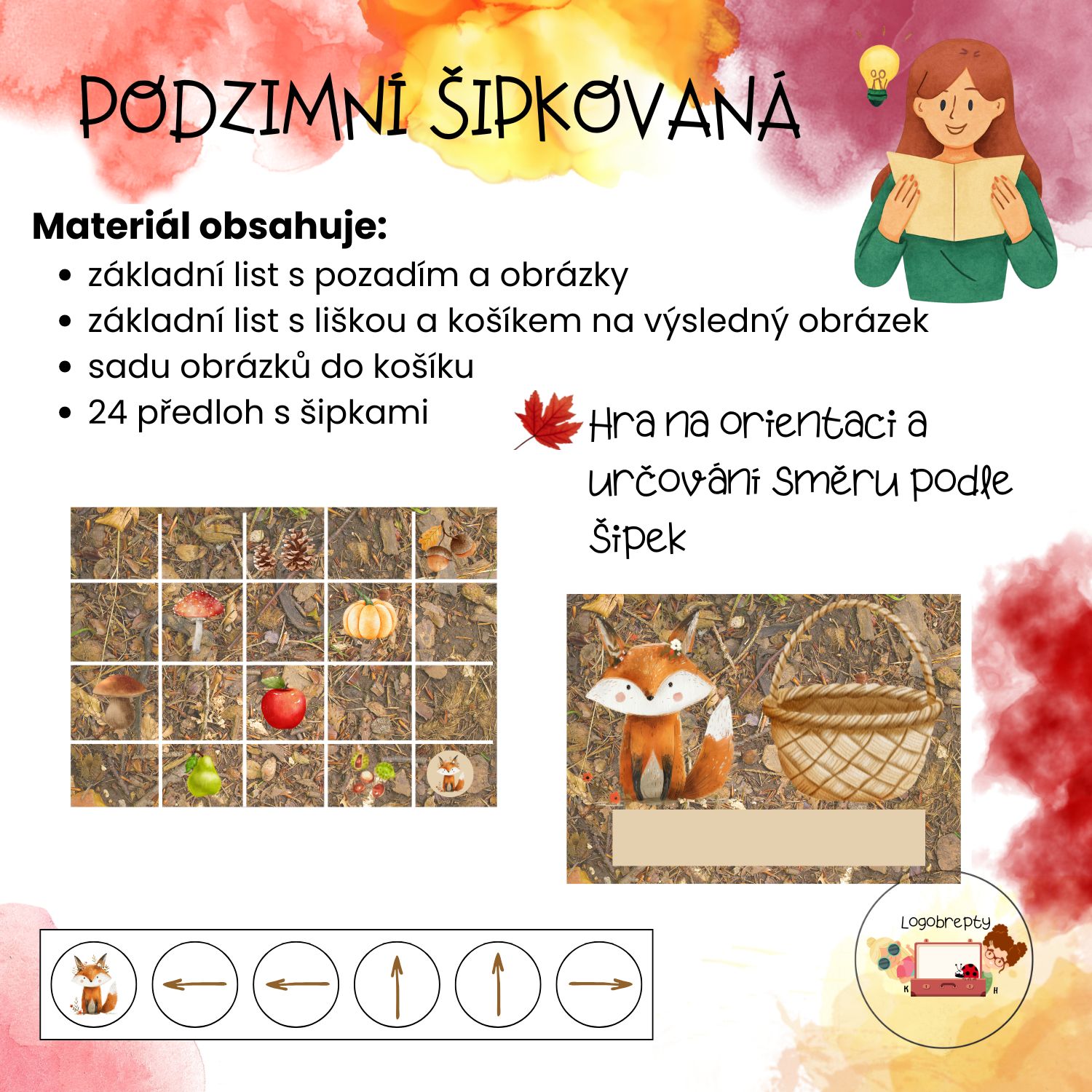 Pomůcka nabízí dětem zábavný způsob, jak trénovat orientaci v prostoru a práci podle jednoduchých pokynů. Dítě položí proužek se směrovými šipkami k lišce, sleduje trasu po obrázkové mřížce a postupně dojde k obrázku, který má poté vložit do liščího košíku.