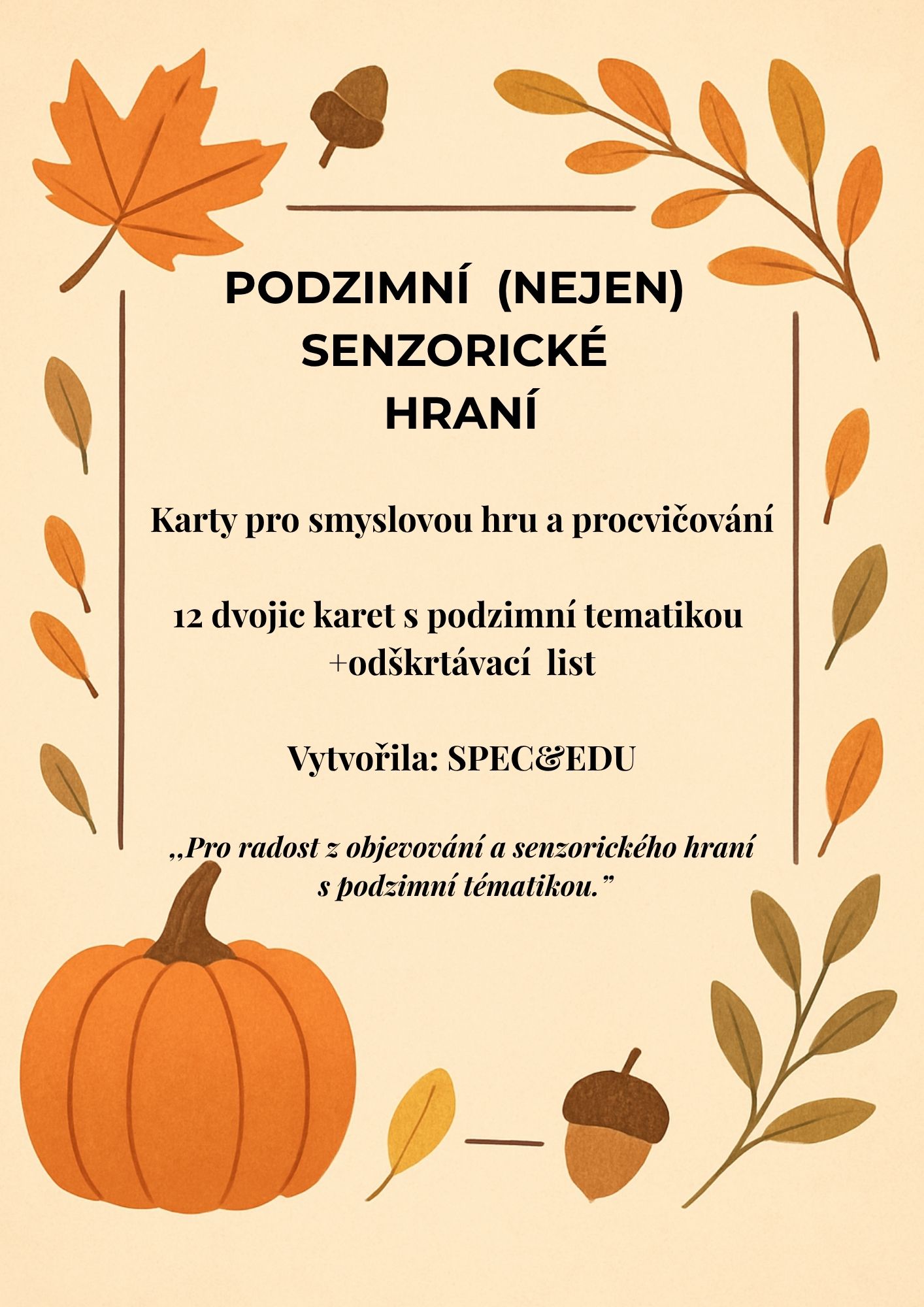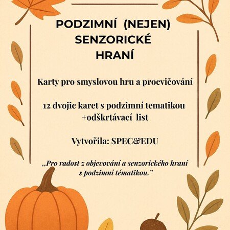 Sada 12 dvojic hracích karet s podzimní tématikou a odškrtávacím listem podporuje smyslové vnímání, jemnou motoriku a soustředění dětí. Materiál lze využít při sensory play, na light panelu, jako pexeso či přiřazovací aktivitu.