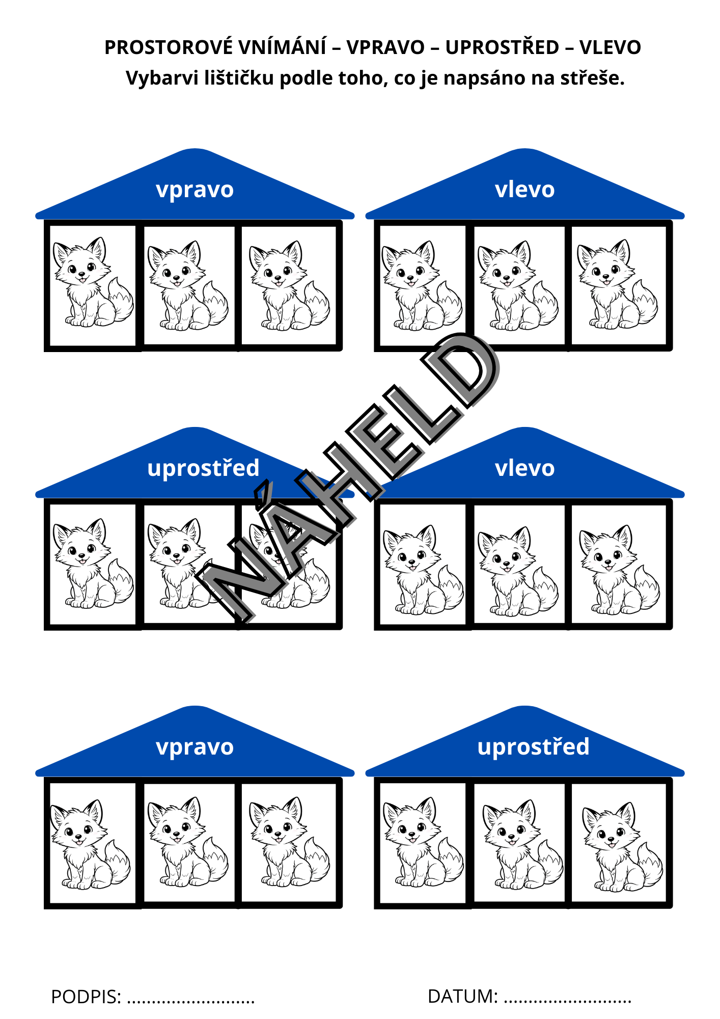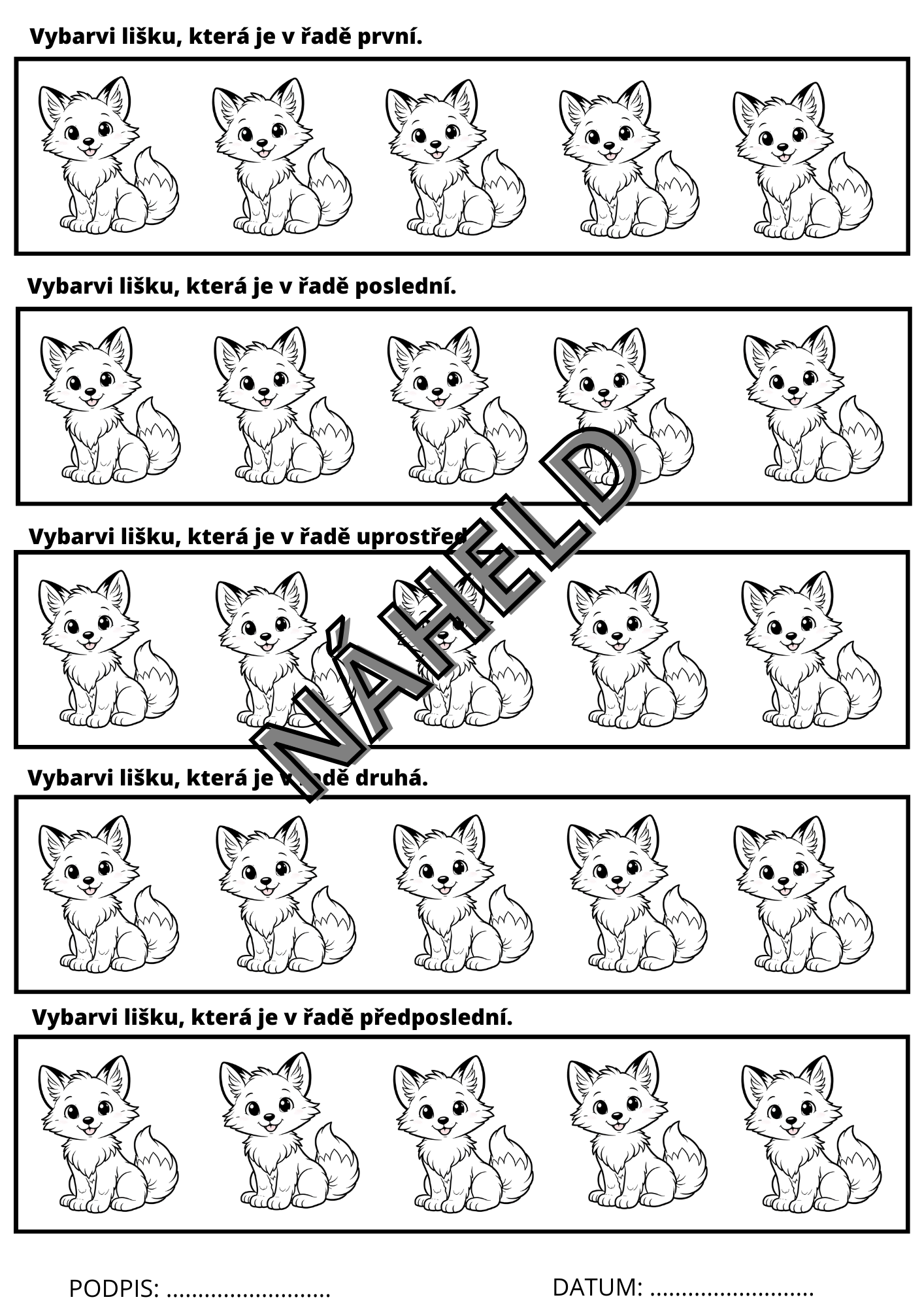 - pracovní listy: určení pozice lišky v řadě, pravolevá orientace, vybarvování správného počtu hrášků a lištiček