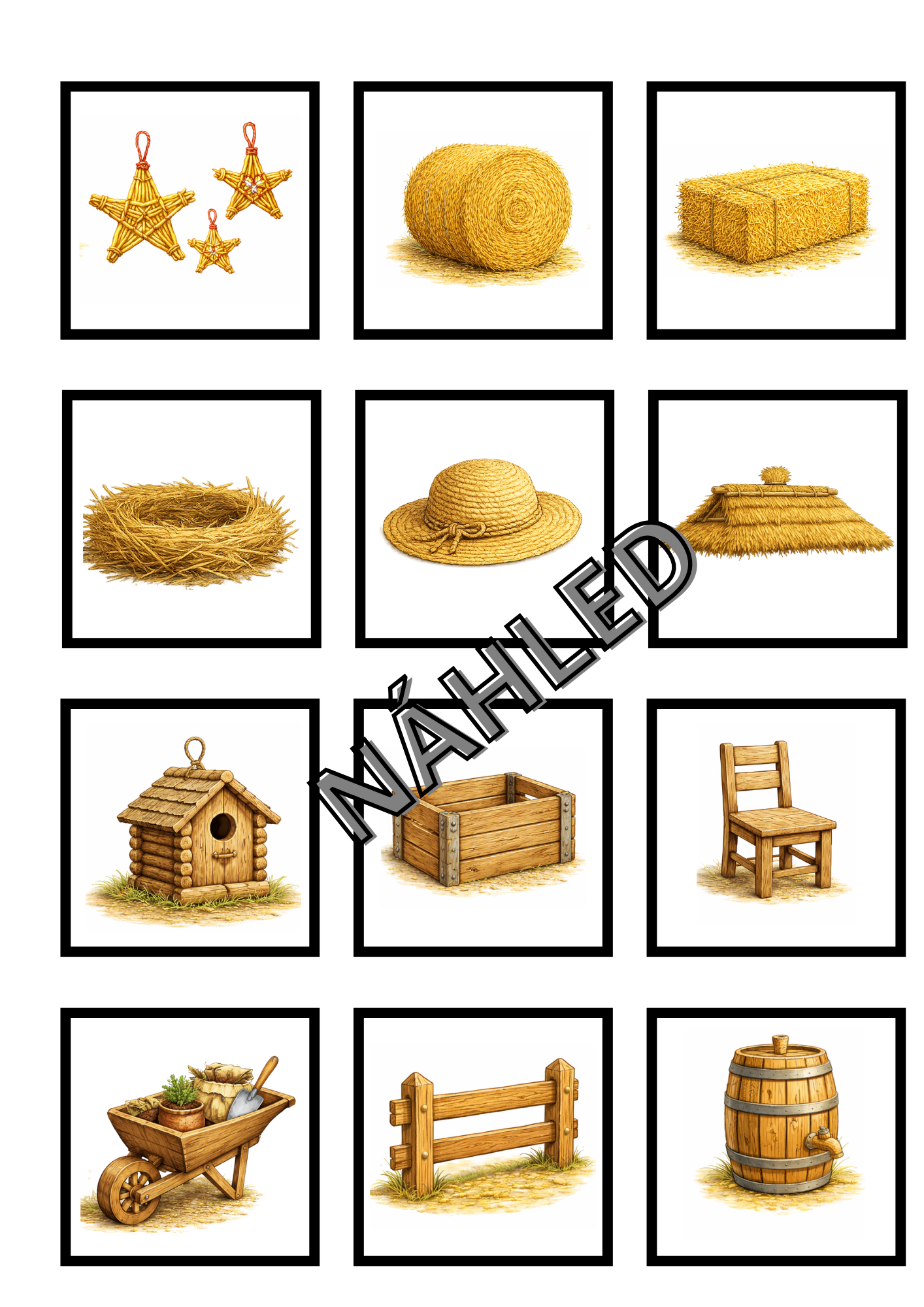 - přiřazování obrázků podle materiálu, ze kterého je domeček vyroben (dřevo, cihla, sláma)