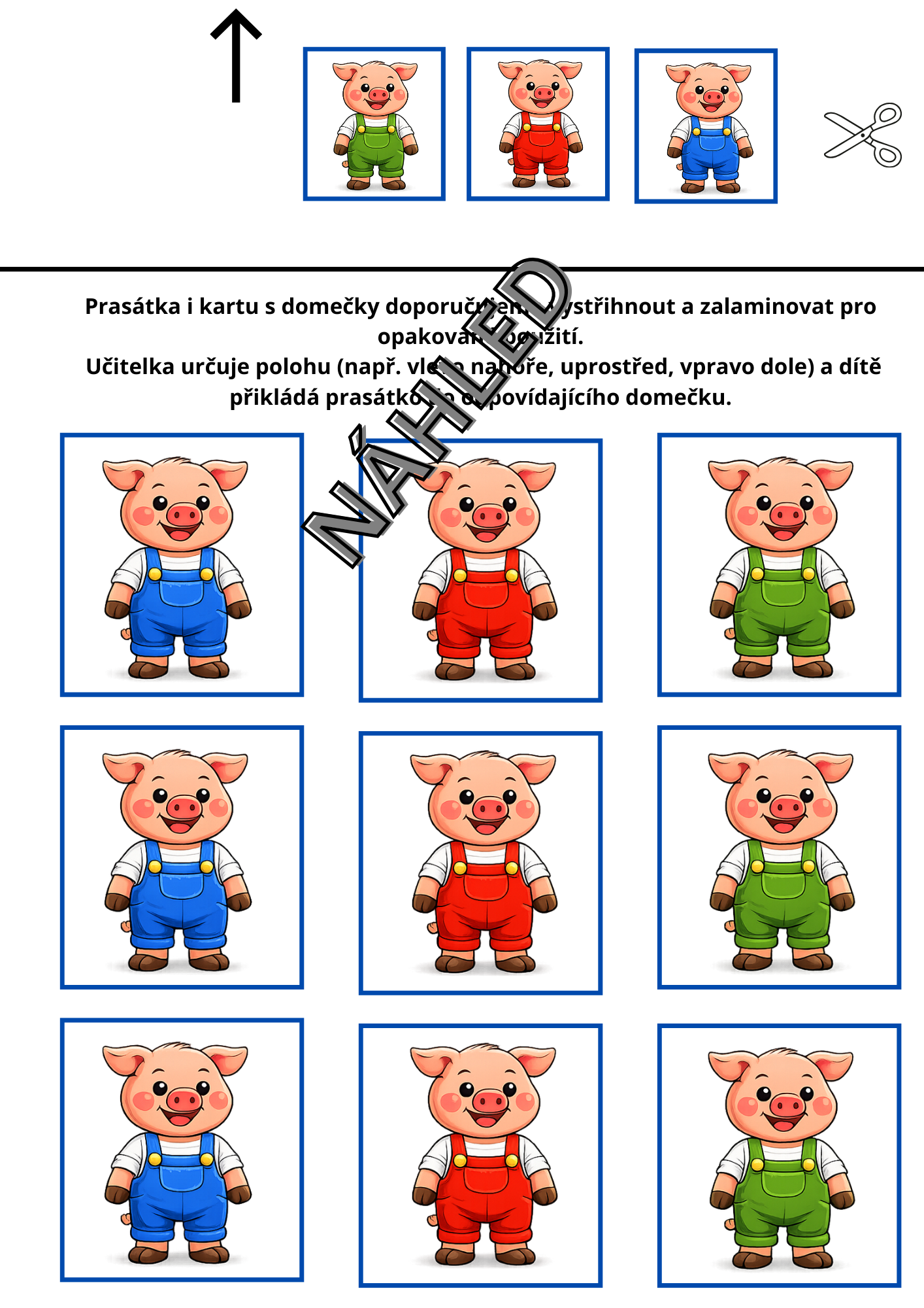 - orientaci v prostoru (vlevo, vpravo, uprostřed) – vybarvování kalhot prasátku podle zadání