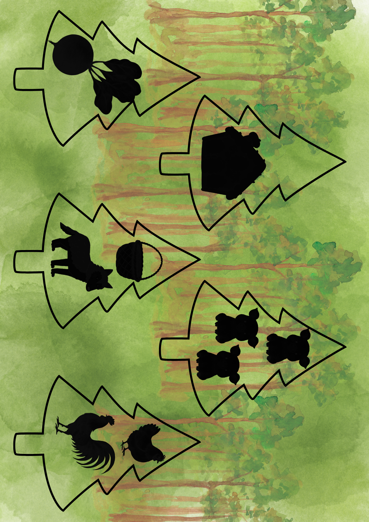 Zábavná aktivita, při které děti pomocí baterky nebo světelného panelu odhalují skryté pohádky ukryté ve stromech. Po prosvícení hádají, o jakou pohádku se jedná, a přiřazují ji ke správnému stínu v lese (doporučen tisk A3).