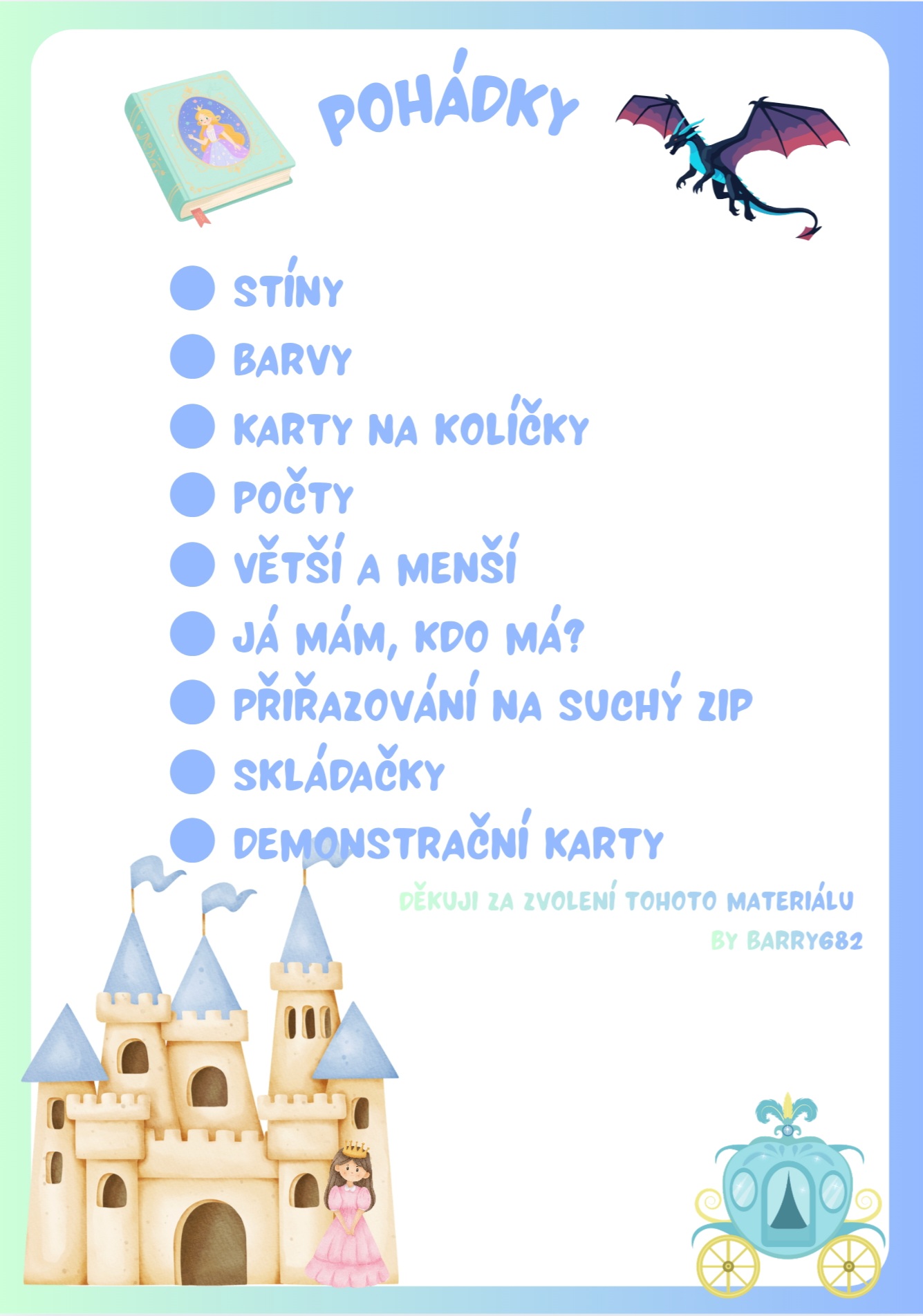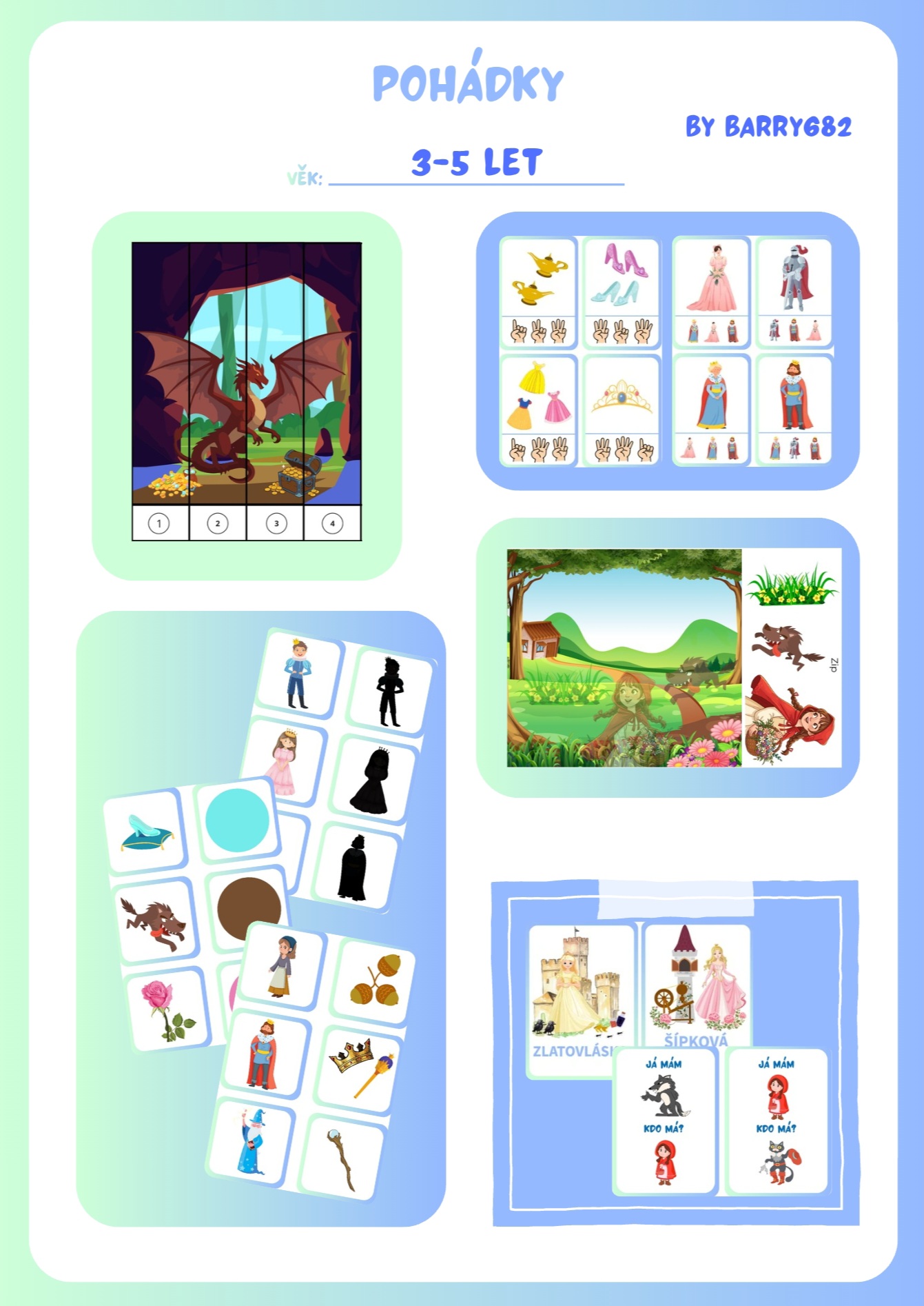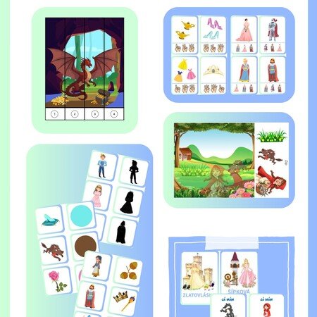 Soubor obsahuje přiřazování stínů, barev, překrytého obrázku a věcí či postav, jež tvoří dvojici. Dále jsou k dispozici kartičky využívající kolíčky (určení správného obrázku a počty za využití obrázku ruky). Hra Já mám, kdo má? (16 karet) a aktivity na suchý zip (přiřazování správné části obrázku a doplnění předmětu či postavy dle stínu). K dispozici jsou také dva obrázky ke složení a demonstrační karty ( Růženka, Zlatovláska, Popelka, princezna se zlatou hvězdou na čele, tři prasátka, Karkulka, kocour v botách)