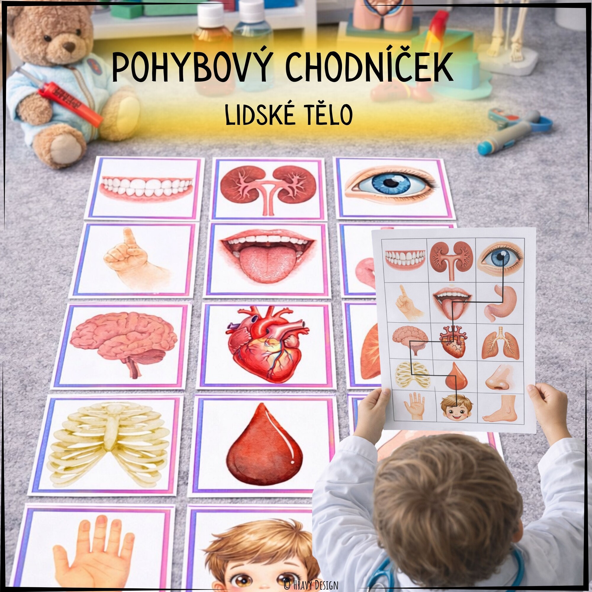 Děti mají k dispozici obrázkové karty rozložené na zemi, které tvoří pohybový chodníček. Podle karty s vyznačenou trasou postupují po jednotlivých obrázcích a našlapují ve správném směru.