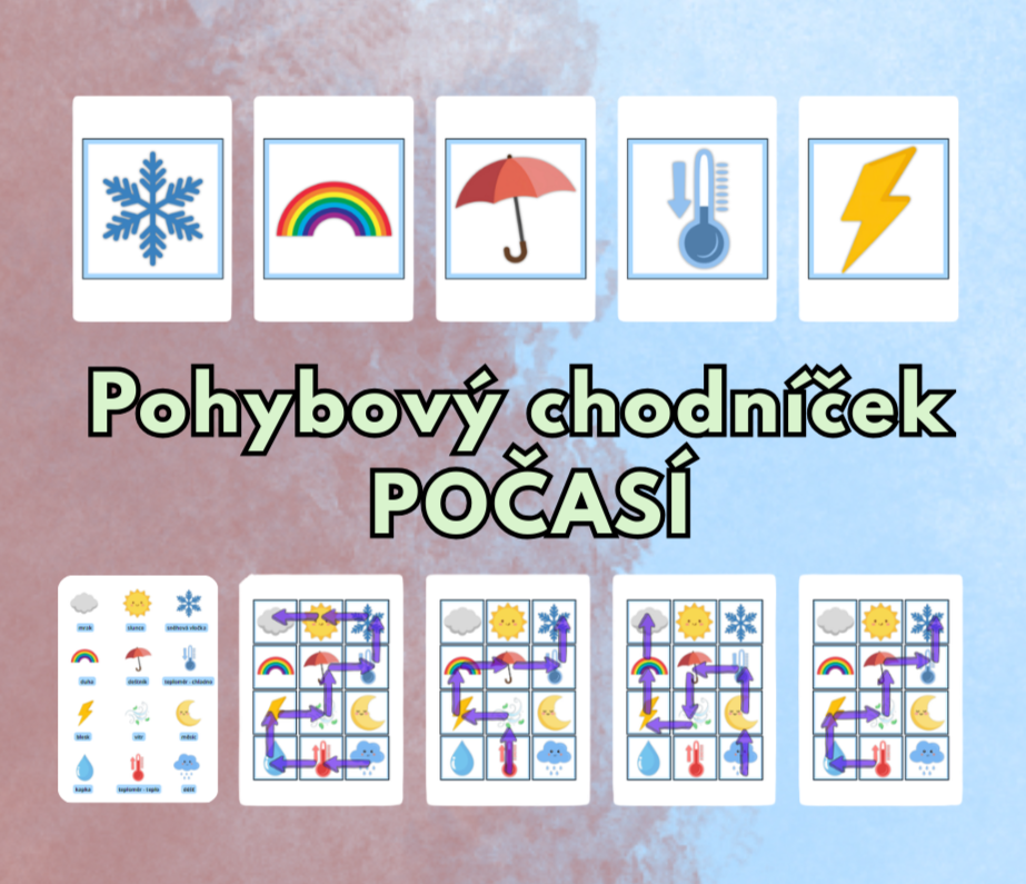 - pohybový chodníček zaměřený na počasí (jednotlivé obrázky se rozmístí podle předlohy na zem a děti dle šablon postupují ve správném směru po určených obrázcích)