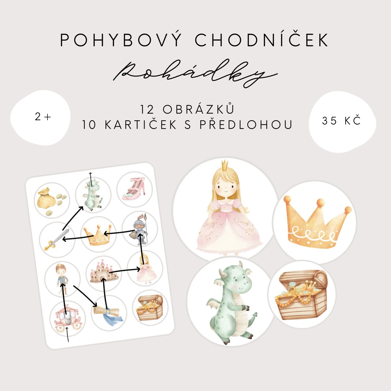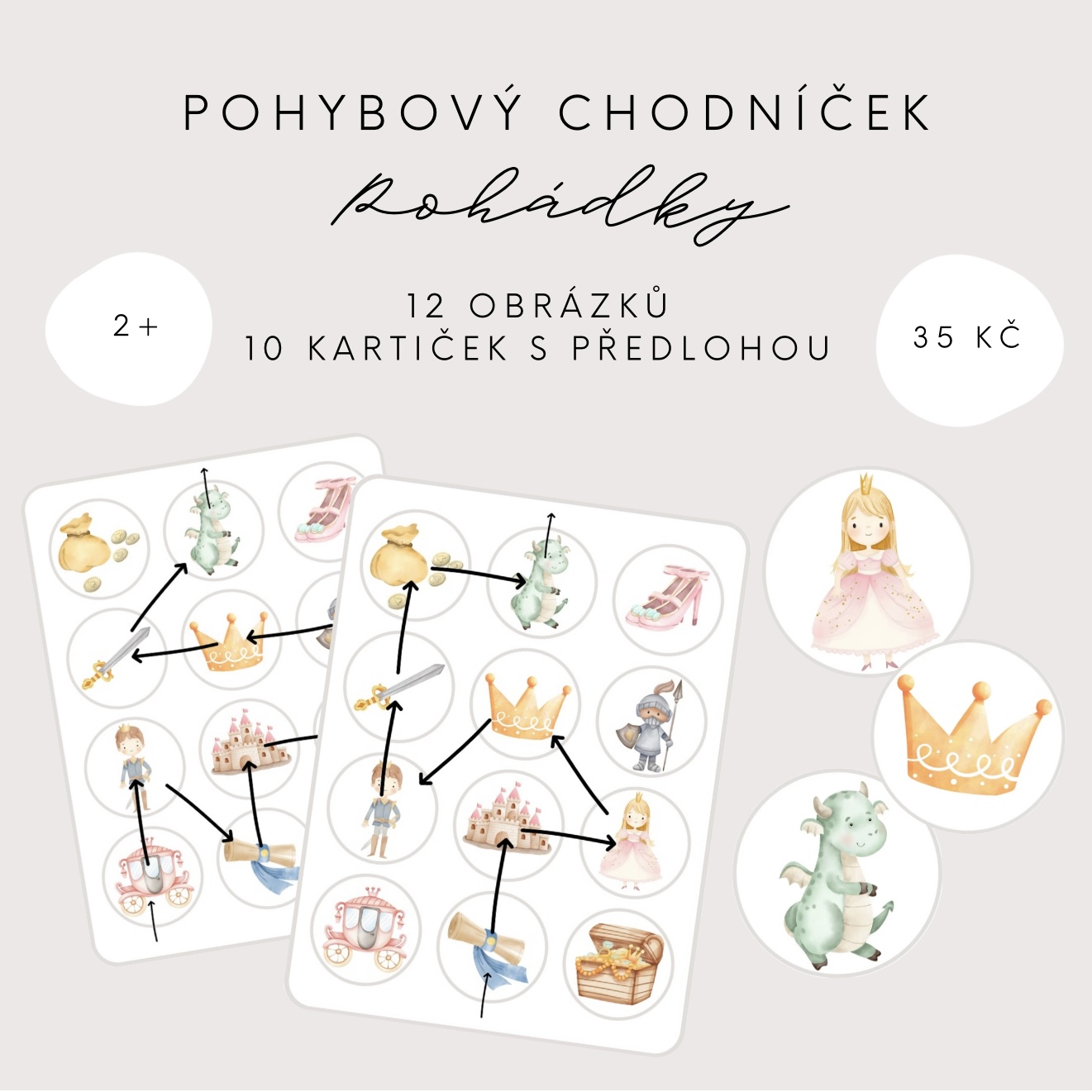 Představujeme Vám náš pohybový chodníček na téma “Kouzelný svět pohádek”, který je určen dětem především předškolního věku. V tomto souboru najdete 12 koleček s obrázky s tematikou pohádek a 10 kartiček s vyznačenou cestičkou.
