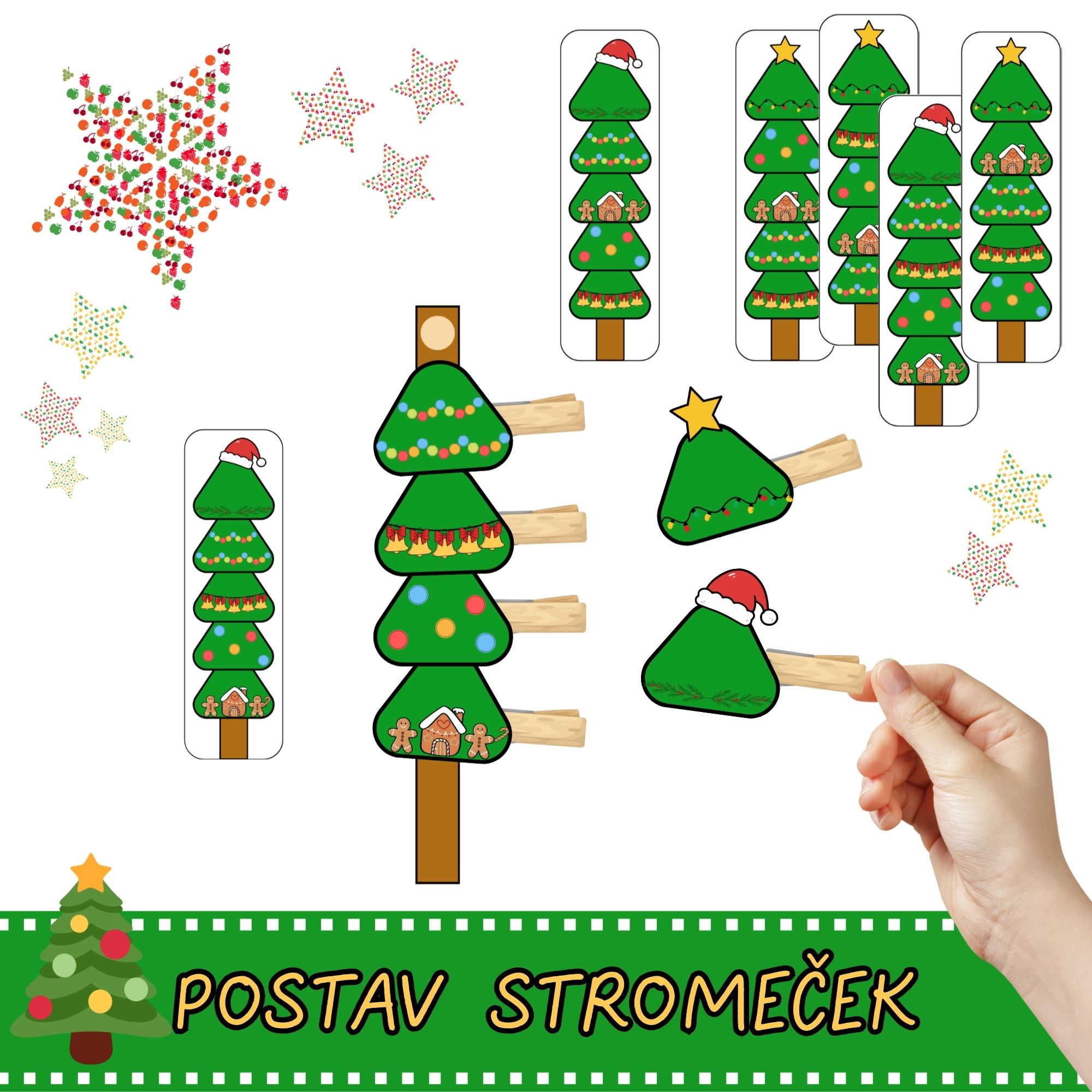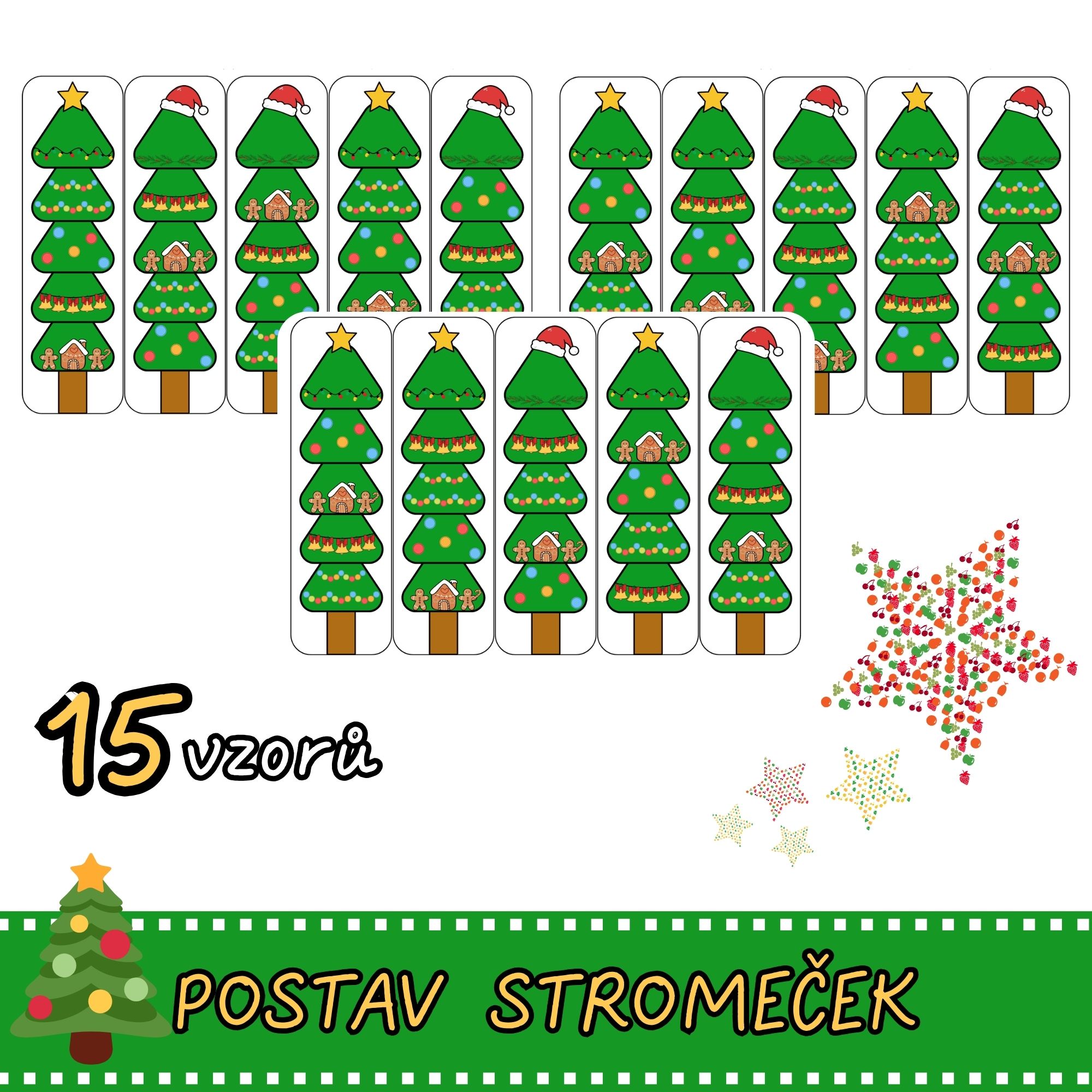 Děti staví vánoční stromečky podle vybraného vzoru. Vybírat můžou z 15 karet vzorů a k dispozici jsou 3 kmeny s jednotlivými částmi stromečku.