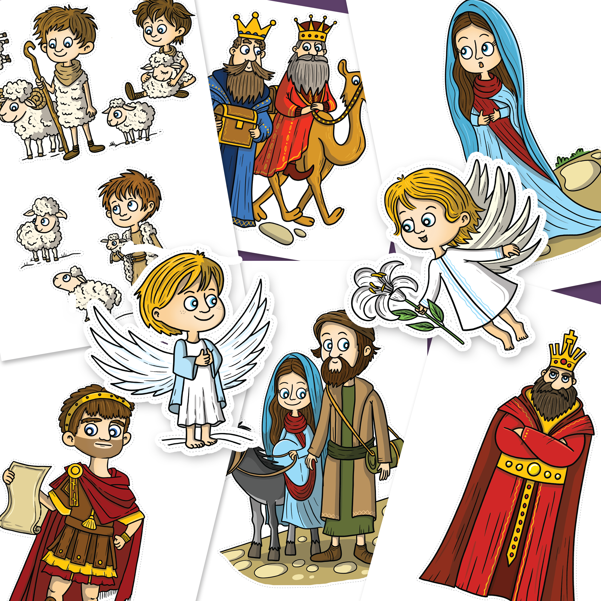 Objevujte vánoční příběh s ilustrovanými postavičkami z Betléma, které jsou připravené jako samostatné, izolované ilustrace k vystřižení.