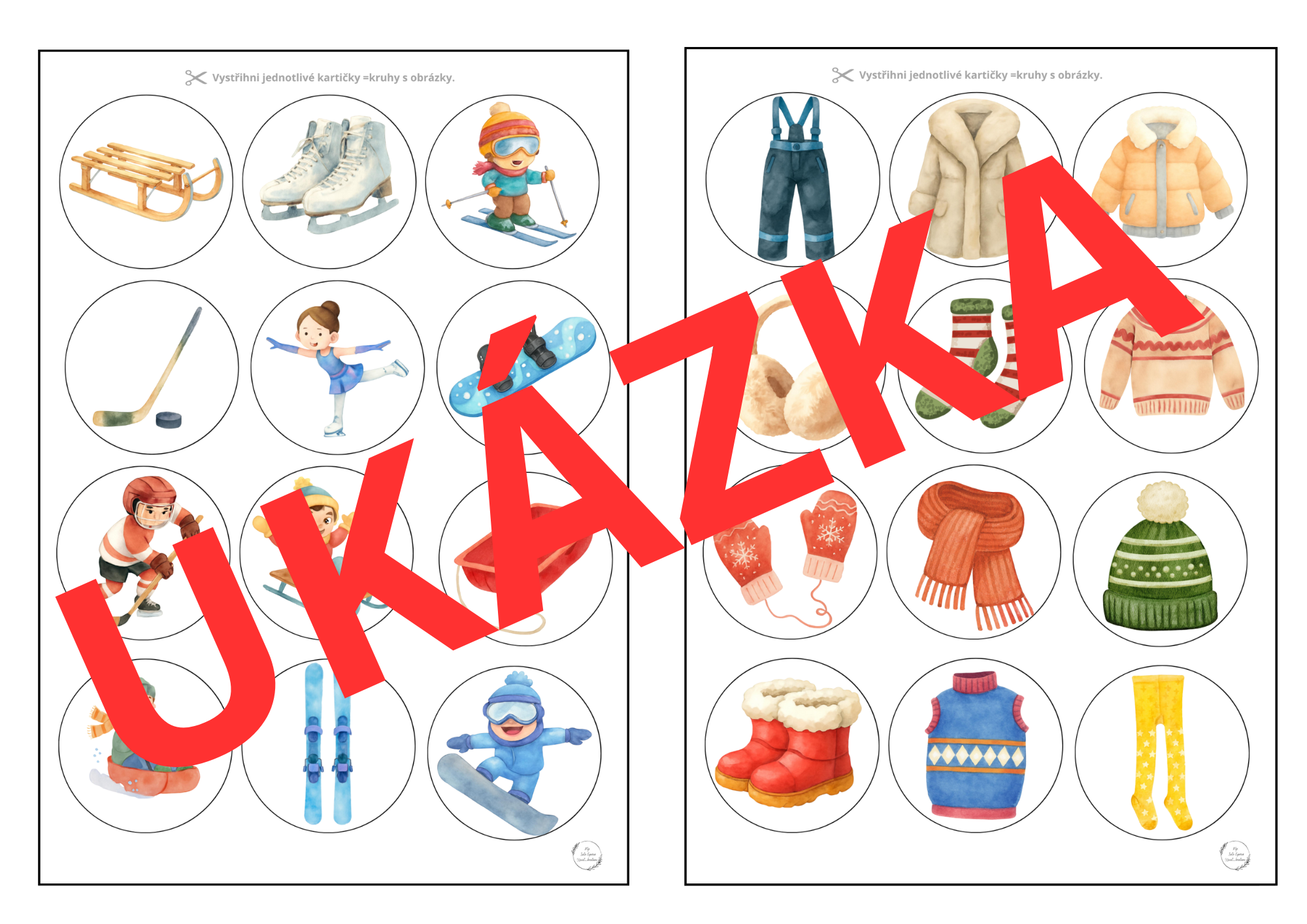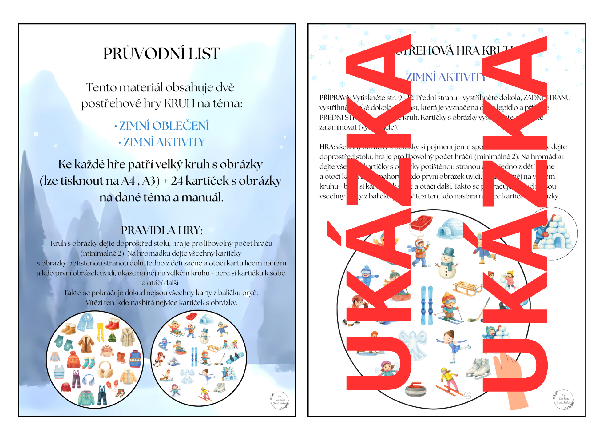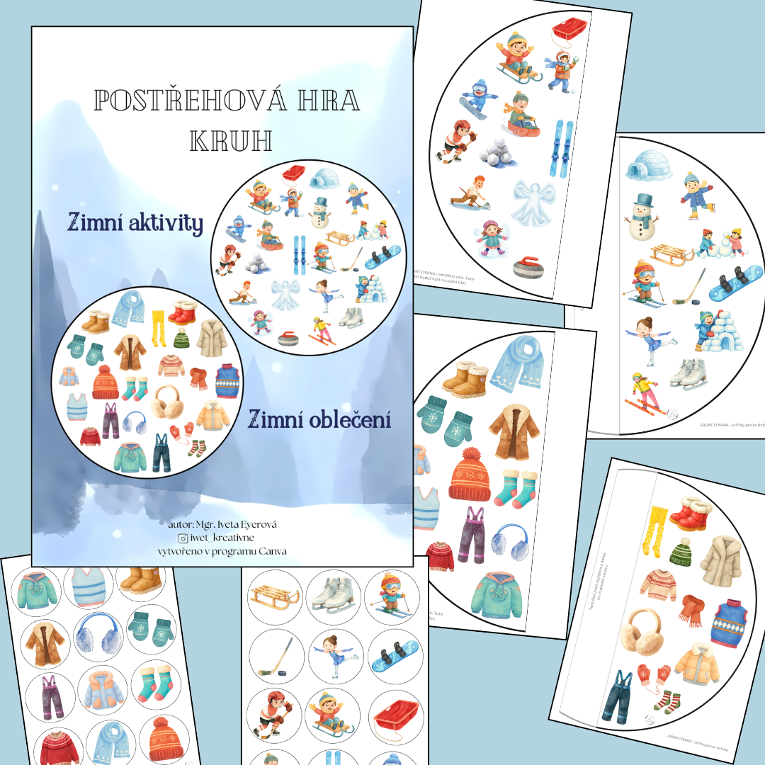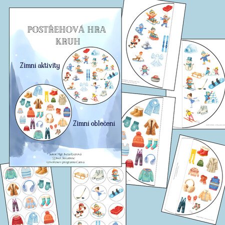 Ke každé hře patří velký kruh s obrázky (lze tisknout na A4 , A3) + 24 kartiček s obrázky na dané téma a manuál.