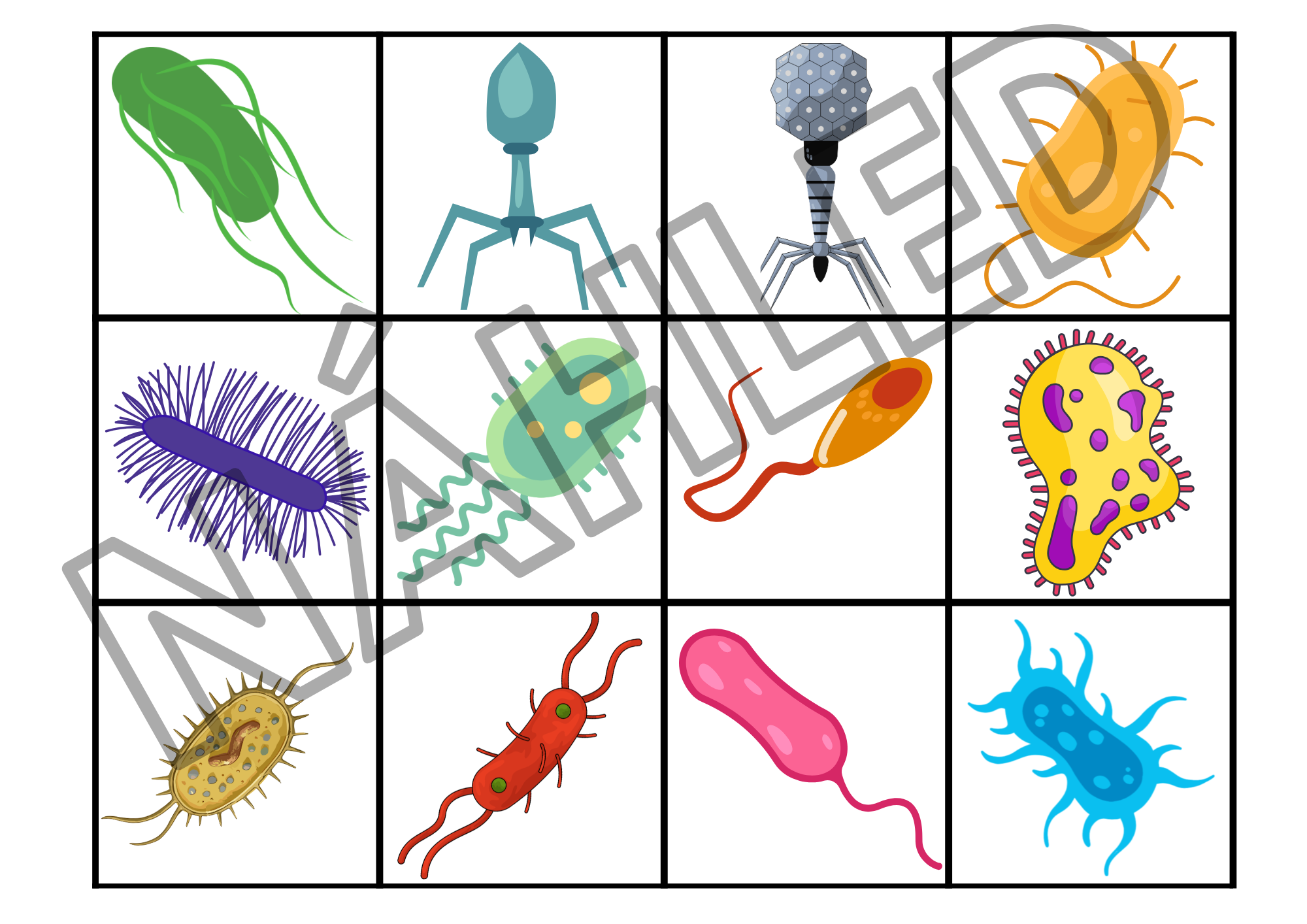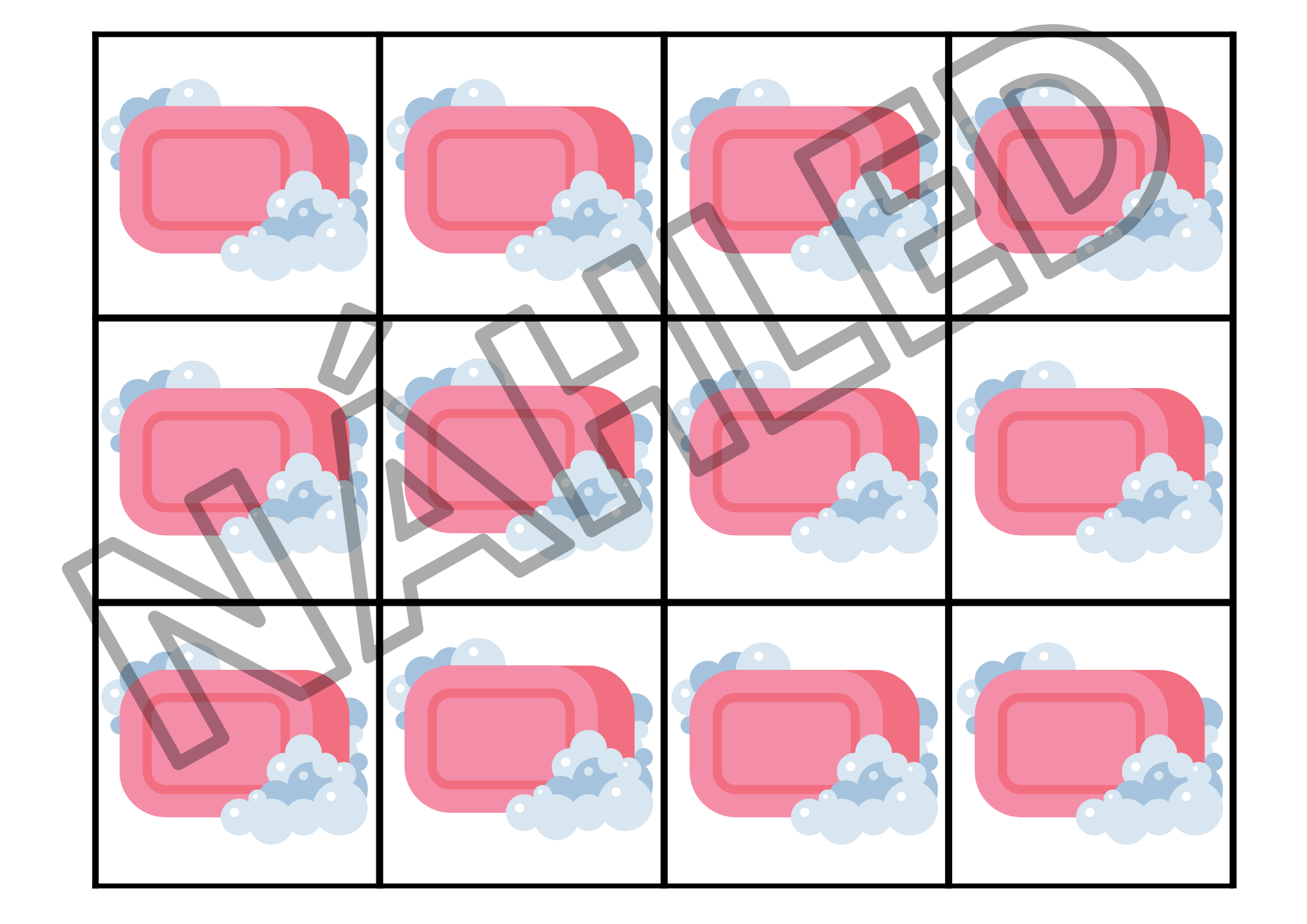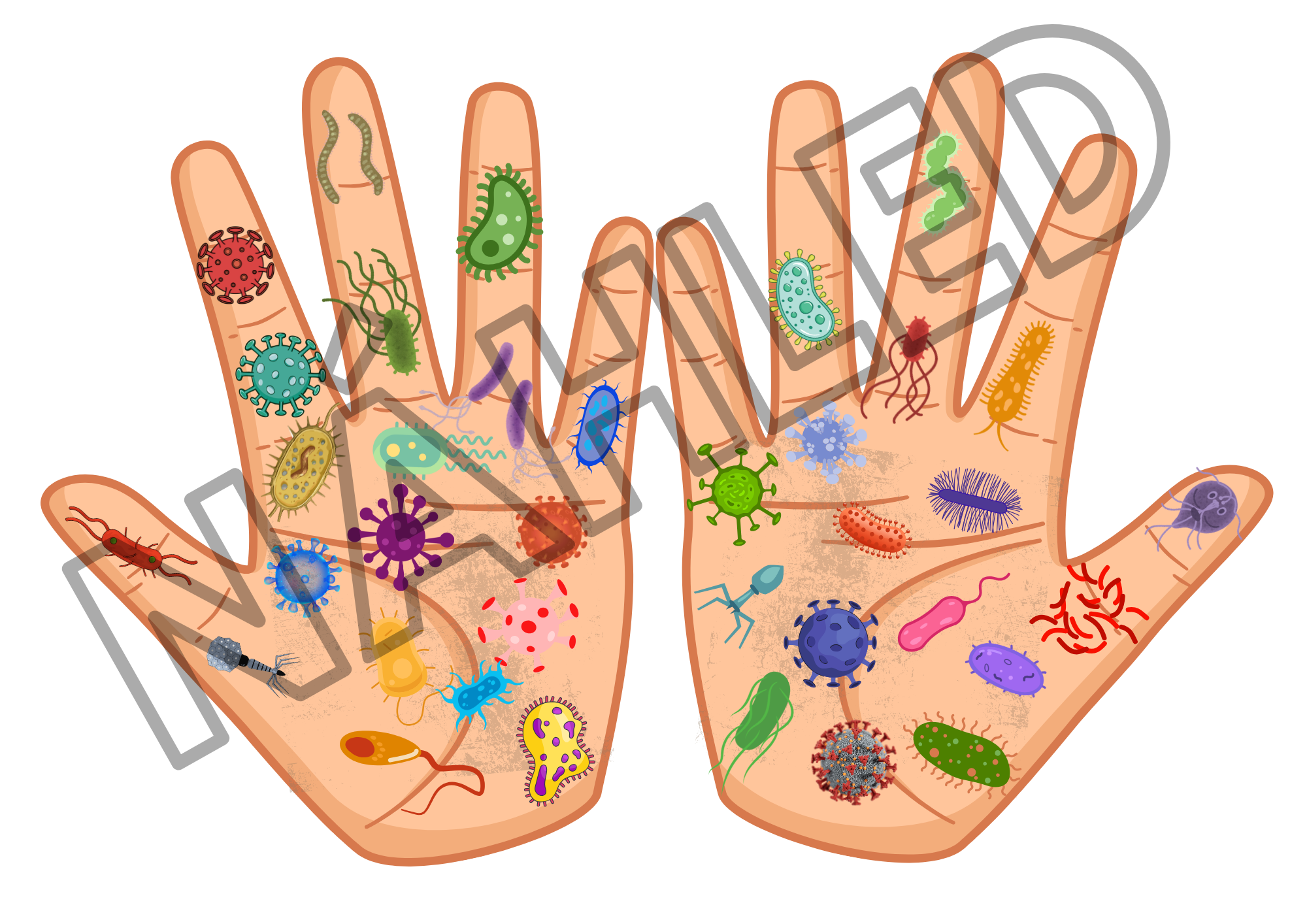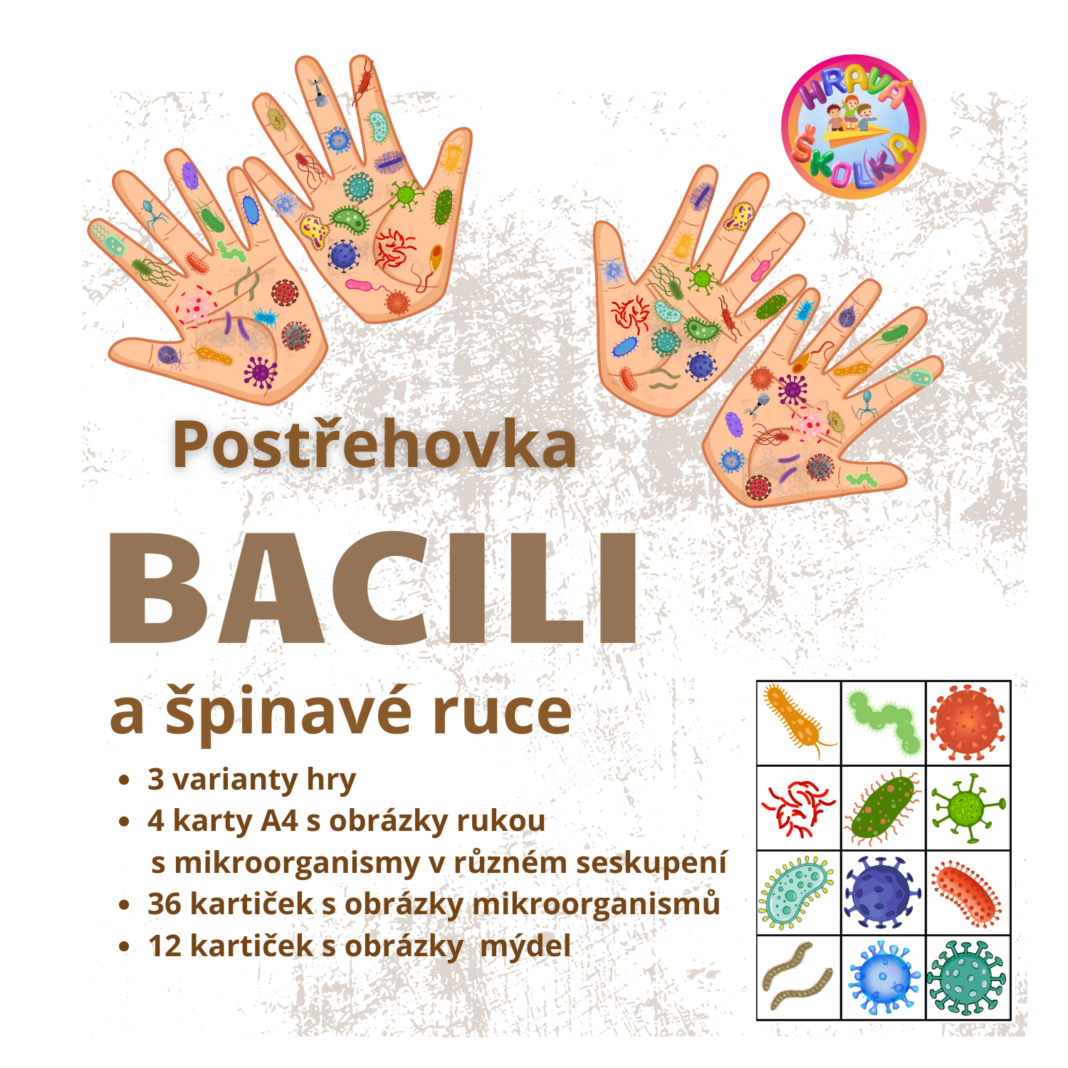 Soubor obsahuje: 4 karty A4 s obrázky dlaní s mikroorganismy - na každé kartě jsou jinak uspořádány. Dále 36 kartiček s obrázky mikroorganismů a 12 kartiček s oblázky mýdla.