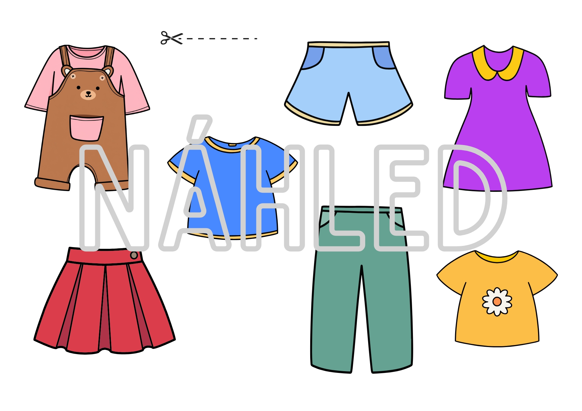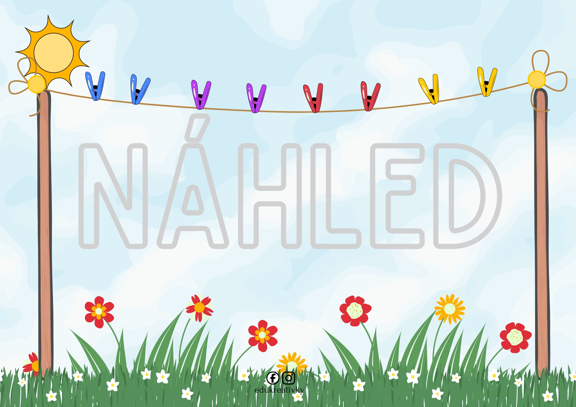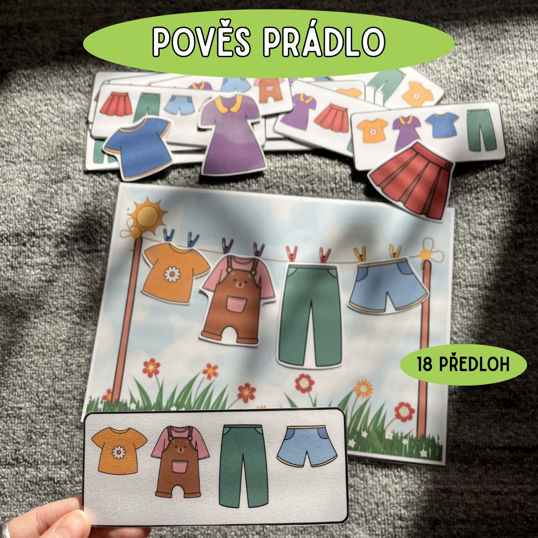Děti sledují předlohovou kartičku a věší oblečení na prádelní šňůru ve správném pořadí. Procvičují tak zrakové vnímání, orientaci zleva doprava, rozlišování barev i detailů a schopnost soustředění.