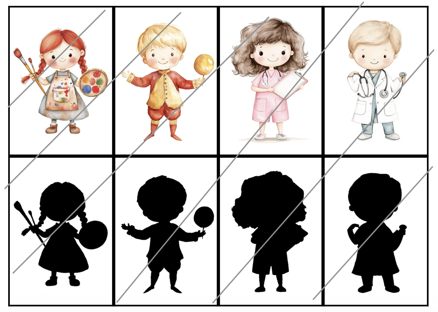 - přiřazování - co patří k danému povolání, kartičky jsou menší než na předloze, je možné k nim přilepit suchý zip pro snazší manipulaci pro děti
