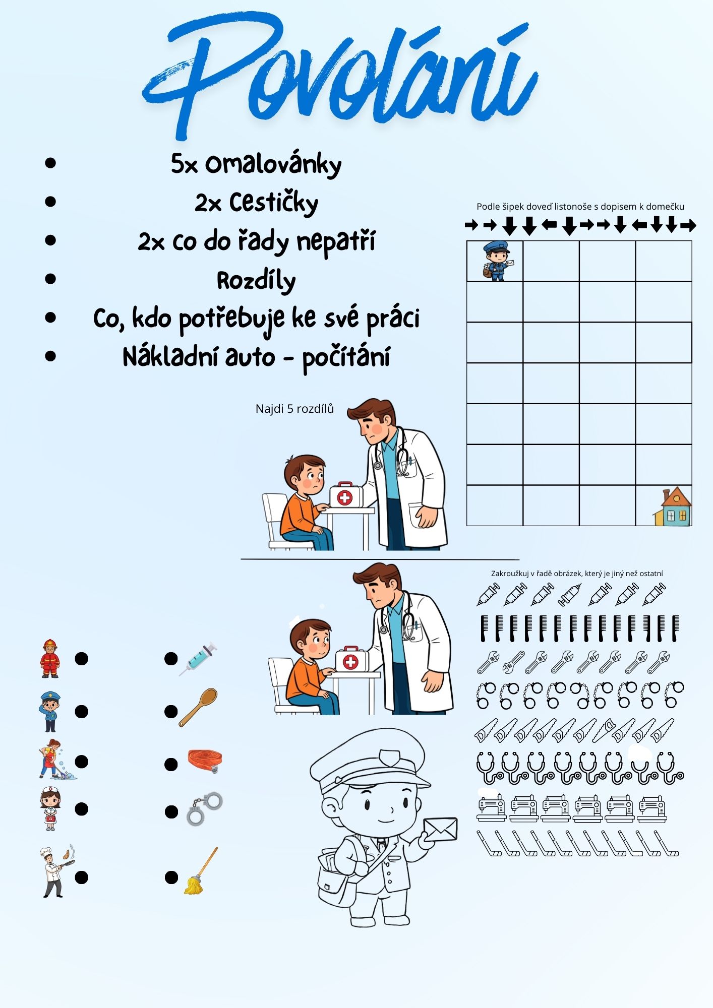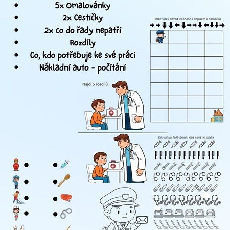 Tento soubor obsahuje : 2x cestu podle šipek s řešením, 5x omalovánka, 2x škrtni, co do řady nepatří, 1x najdi 5 rozdílů, 1x přiřaď co, kdo potřebuje ke svému povolání, nákladní auto - počítání