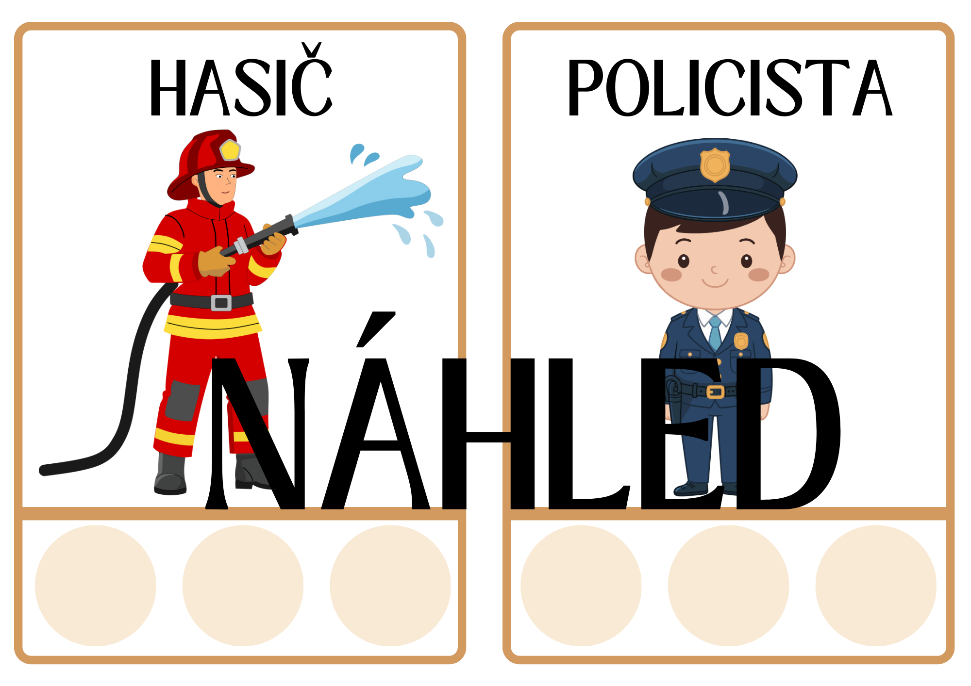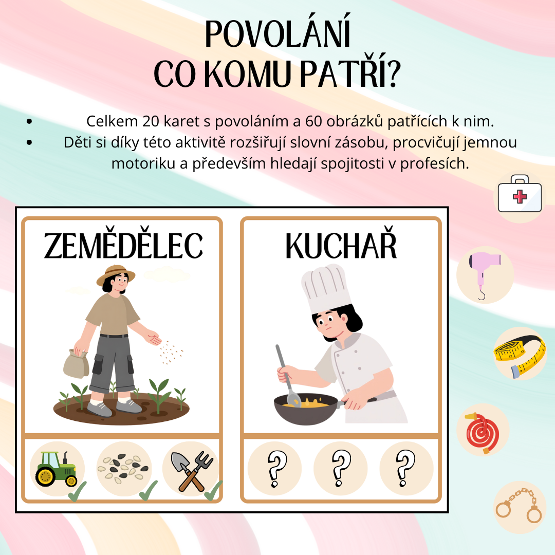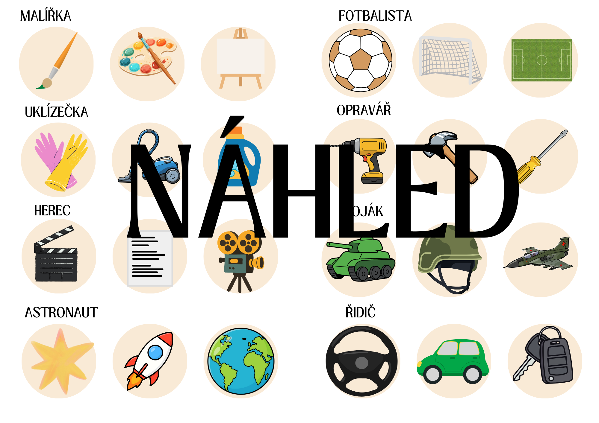 V tomto souboru najdete celkem 20 karet s povoláním (hasič, policista, veterinářka, doktor, kadeřnice, zpěvák, prodavačka, učitelka, zemědělec, kuchař, švadlena, pošťák, malířka, fotbalista, uklízečka, opravář, herec, voják, astronaut, řidič) a 60 obrázků patřících k nim.