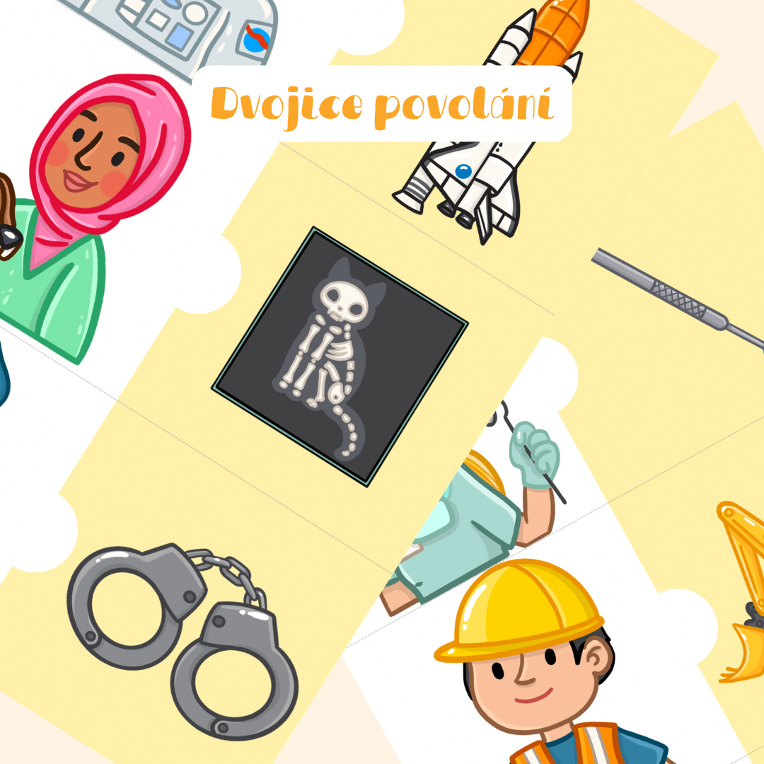 - Dítě nejprve pojmenuje povolání, poté přemýšlí, který předmět k němu patří, a obě části spojí. Po vytvoření dvojice může svou volbu slovně zdůvodnit.