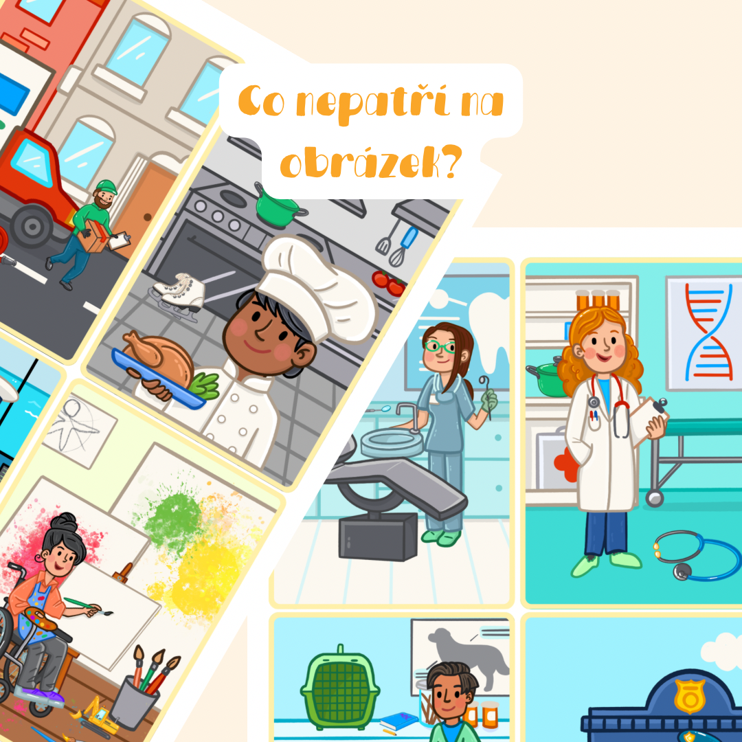 - Dítě obdrží obrázek, na kterém je znázorněno určité povolání v typickém prostředí. Na obrázku se nachází jeden předmět, který k danému povolání nepatří.